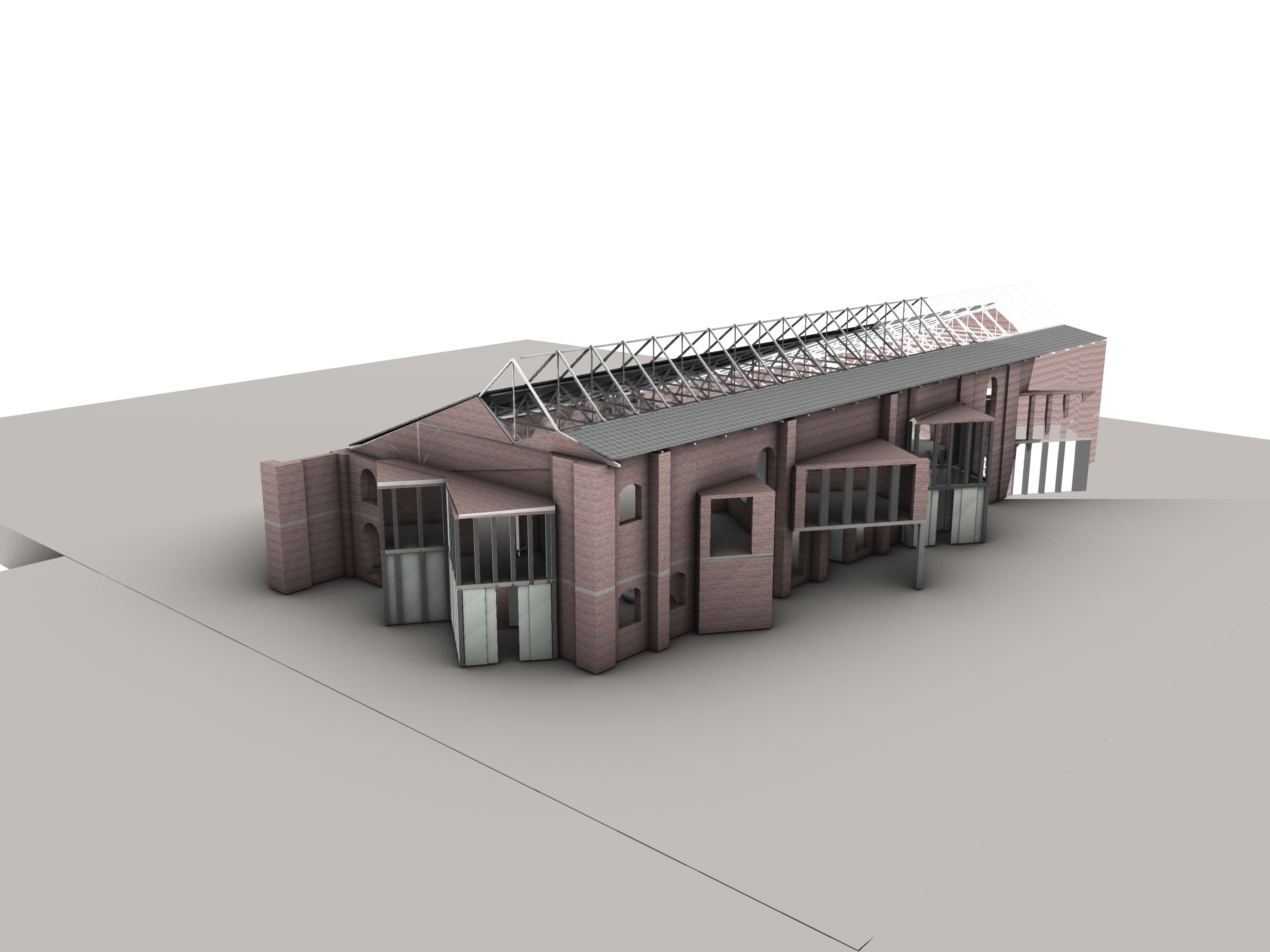exterior shot leave the brick walls and roof as it is add light grass and trees around architecture