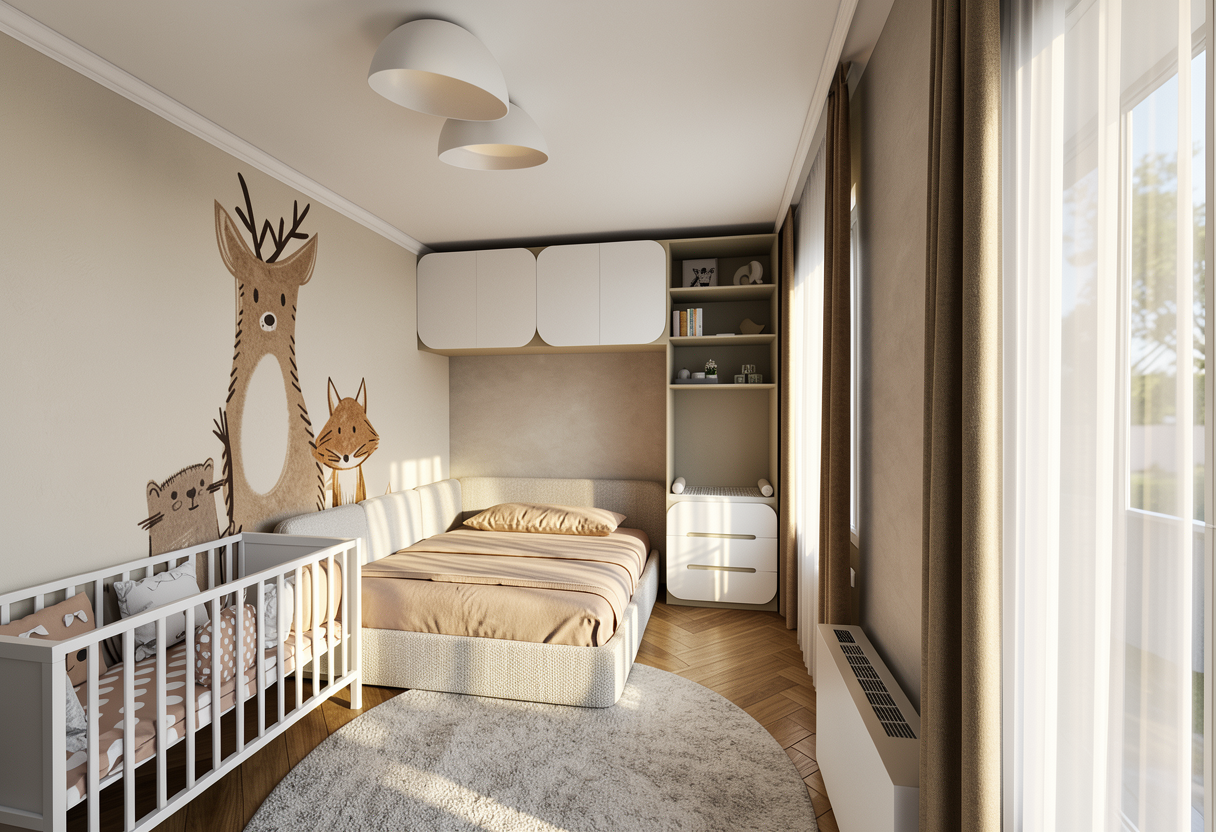 minimalism interior shot create a beautifully rendered architectural floor plan showcasing a modern residential layout use soft neutral tones for the walls and floors with a gentle warm cream color for the walls and rich oak wood for the flooring highlight the furniture with elegant deep blue and gray accents incorporate lush greenery around the plan for a refreshing look add soft ambient lighting for a cozy and welcoming atmosphere making the space feel airy and spacious surround the terrace area with a vibrant mix of potted plants and comfortable outdoor seating in earthy tones architecture