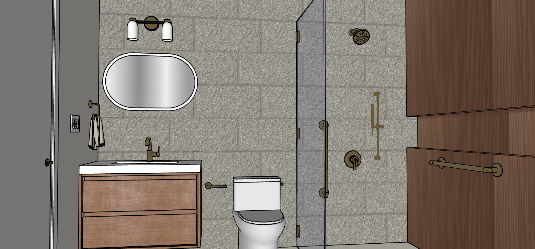 preserve all existing geometry materials and proportions lighting comes only from the vanity light mirror backlighting and ceiling fixtures the mirror has a soft white backlit halo 3000k evenly diffused the shower head and all shower fixtures are not light sources and emit no light no lighting exists within the shower or niche the back wall wood panels remain unchanged overall scene is evenly brightened using neutral 3500k ceiling lighting only do not add highlights glow reflections or new light sources all fixtures and accessories have a brushed brass finish soften the edges of the tiles on the left wall vanity light scones are semi transparent white glass left has light off white paint and the door and its frame is white