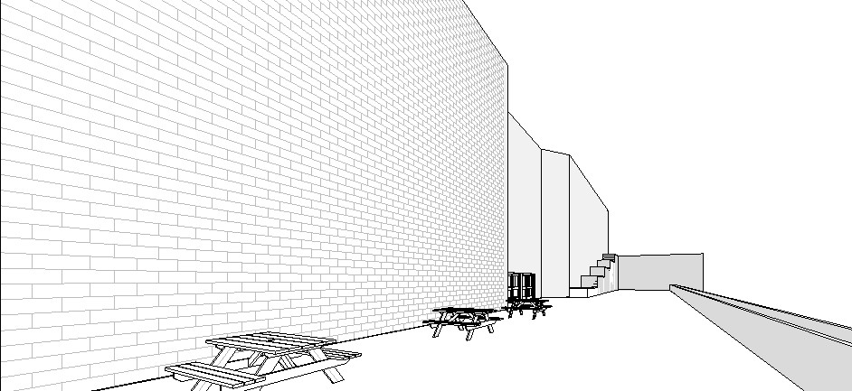 red brick building red brick planters planters filled with trees shrubs and flowers bocce ball court chess tables with old men and women sitting by them and walking around the area extend patio tiles to the right add trees flowers and shrubs into the planter boxes remove curbing from the patio and continue tile to the planter boxes