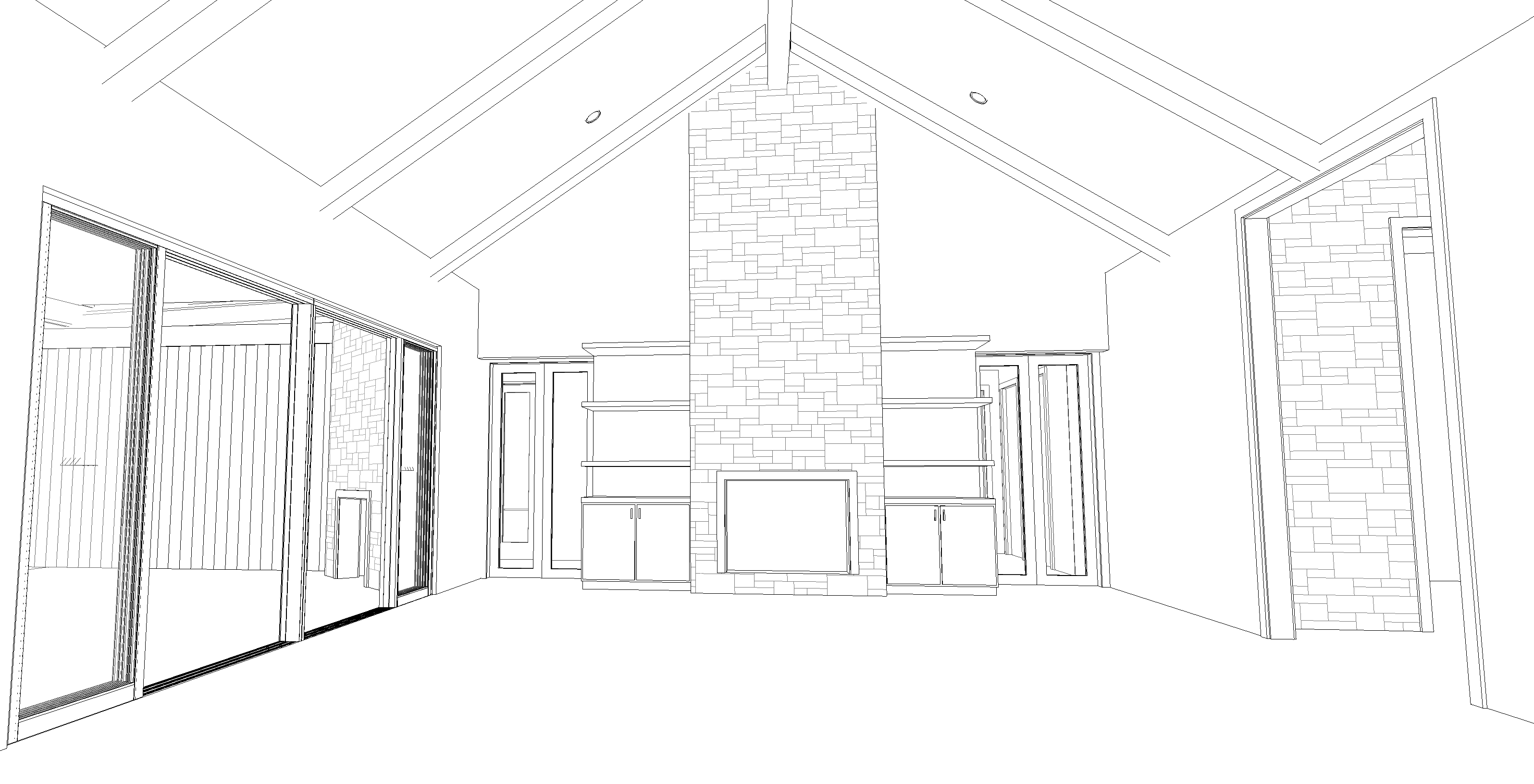 a spacious living room with a vaulted ceiling and exposed wooden beams bathed in soft warm natural light the central stone fireplace in shades of light gray with hints of beige flanked by built in white shelving units large modern glass doors on the left with sleek black frames opening to a serene outdoor view the walls are painted in a soothing off white enhancing the airy atmosphere the floor is a rich dark hardwood adding warmth and contrast the overall ambiance is cozy inviting and elegantly modern