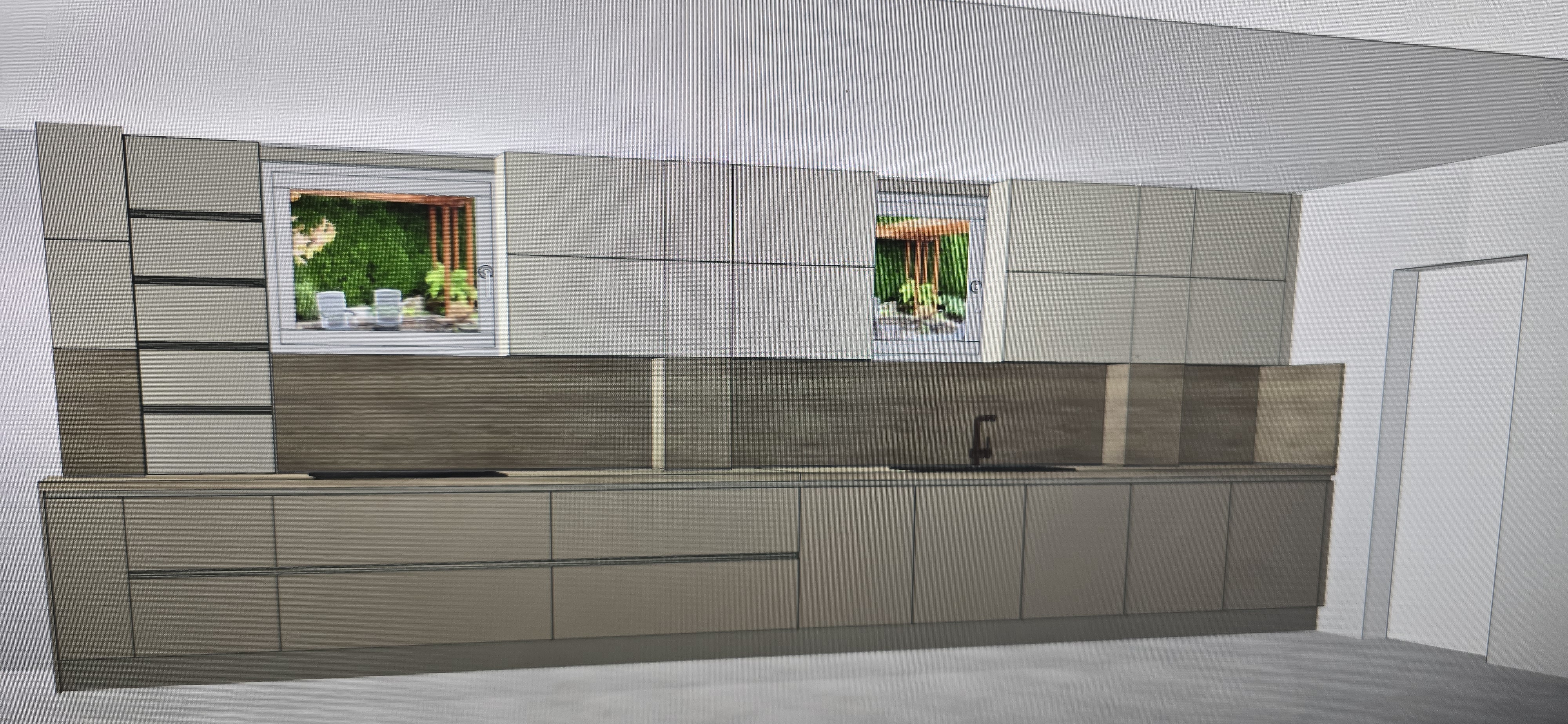 render a modern kitchen interior with sleek cabinetry using soft beige and warm taupe tones for the cabinets add elegant matte black handles and faucet for contrast incorporate a wood textured backsplash in muted earth tones creating warmth and depth the countertop should be the same color as the backsplashes through the windows depict a lush green garden with vibrant plants for a refreshing outdoor view the atmosphere should be calm and inviting with soft natural lighting enhancing the serene and stylish ambiance please add some dining furniture in compatible colors and just few kitchen decorations the hob is bora xpure 80cm wide the tap is blanco metra xl 6 s in blavk color
