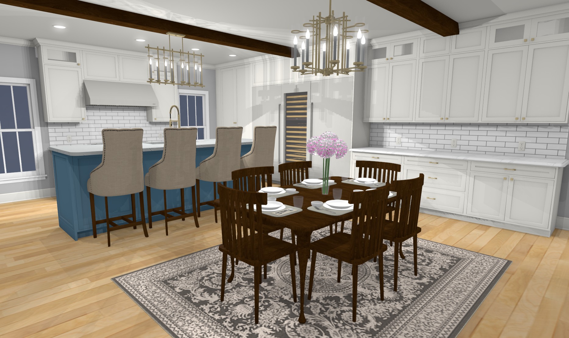 contemporary interior shot keep all cabinets as is ceiling beams stained wood keep window locations keep french door locations change backsplash to match countertops architecture