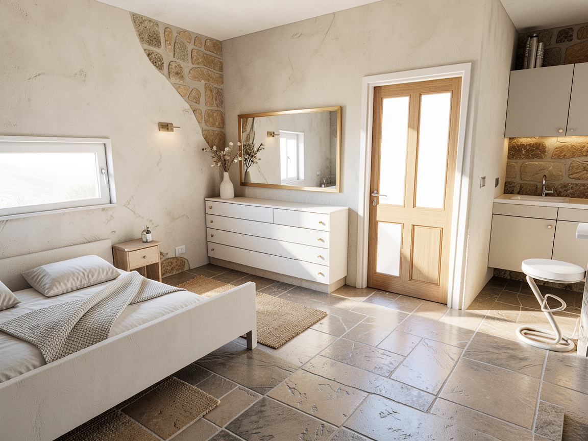 stile mediterraneo moderno colori chiari pavimento effetto resina lusso porte chiare