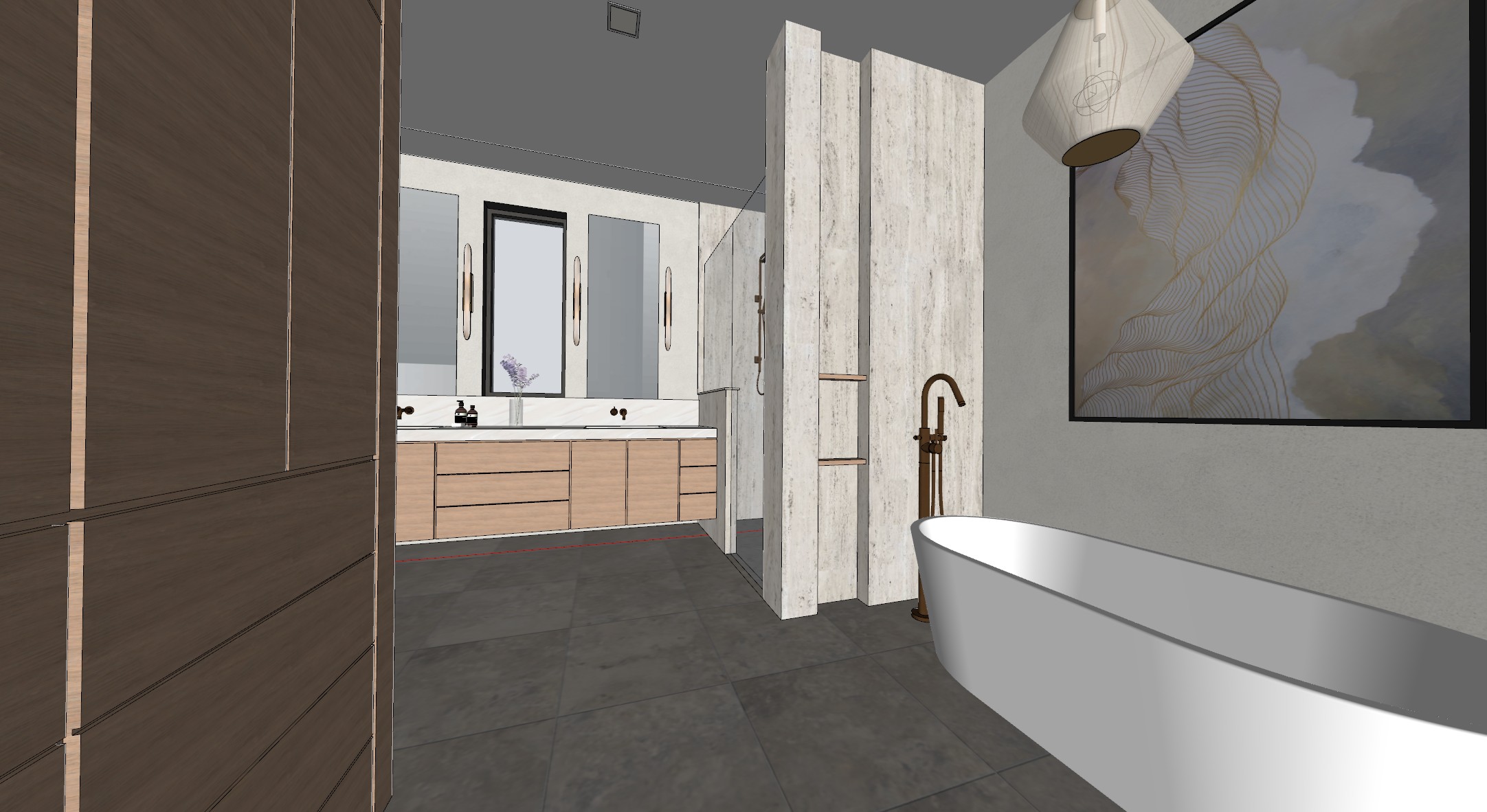 make bathroom look realistic make floor tile lighter two mirrors and a window in between above vanity dont additional architectural items