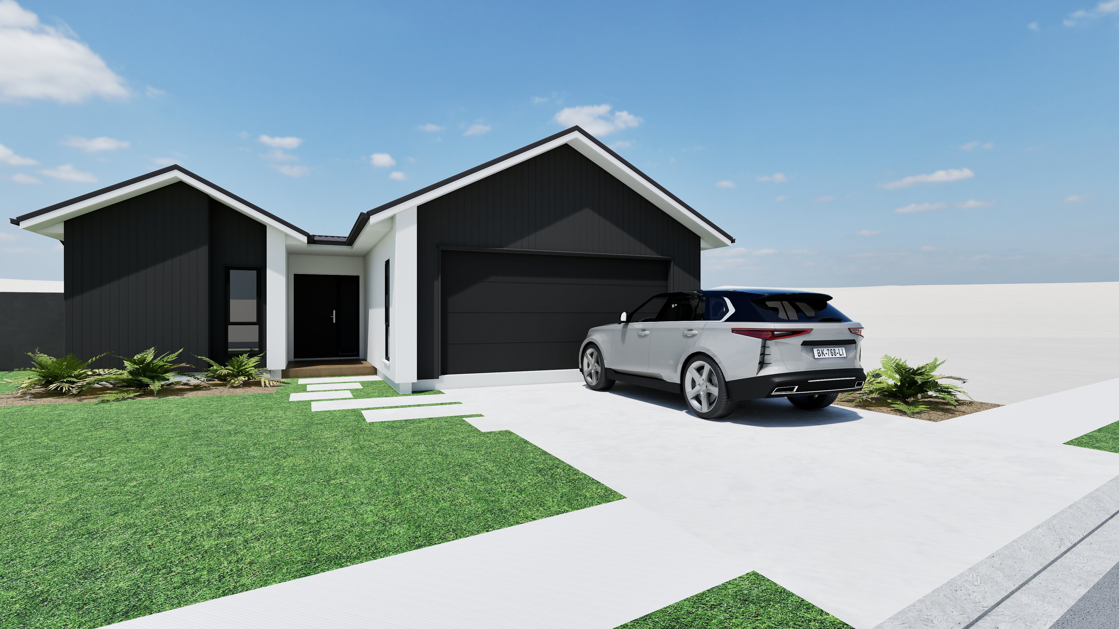 black cladding to house with white plaster features black window frames timber deck manicured lawns extensive native planting smooth concrete driveway and footpath background trees at sunset