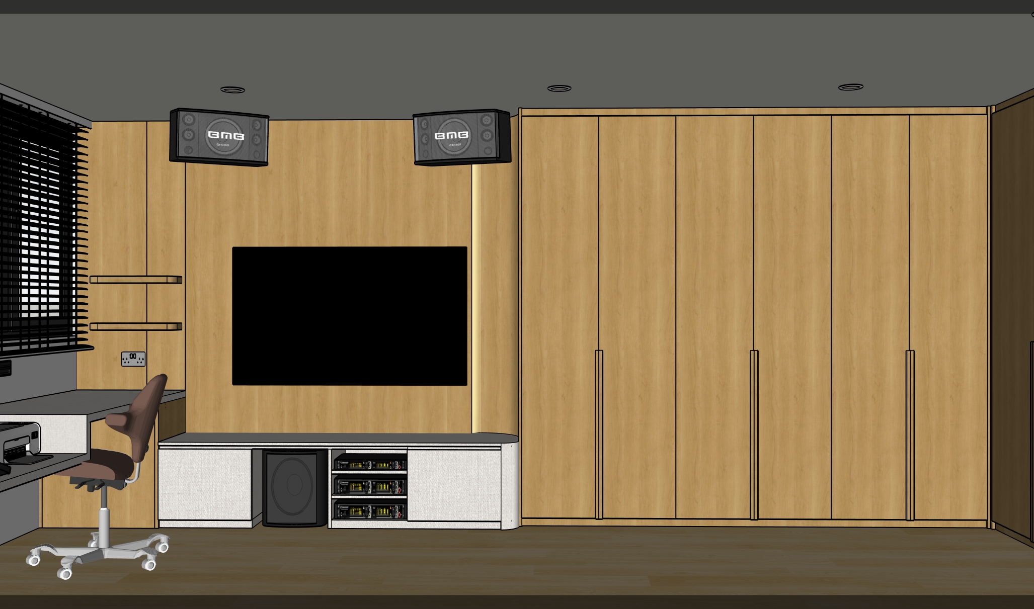 colours and wood texture less grains to remain accurate as per given picture blinds in off white tv console and top in like fabric off white study table top in like fabric off white full height cabinet door handle protrude out by 20mm ceiling in off white