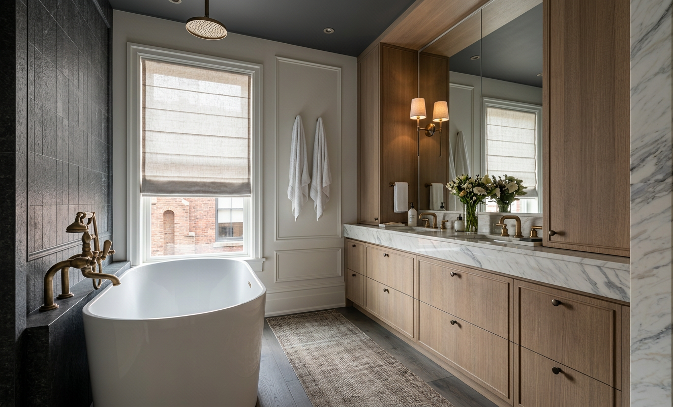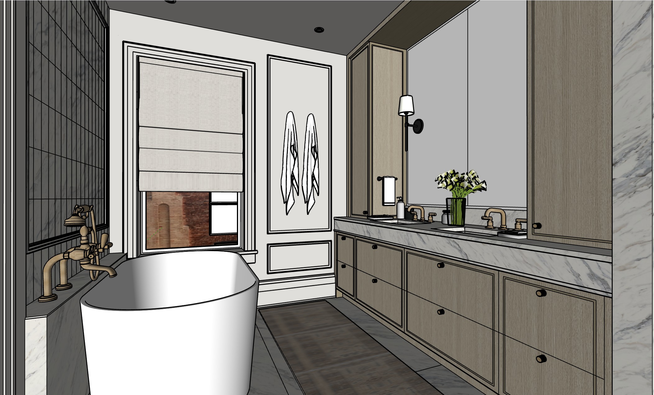 keep everything the same but the floor and wall on the left side should be the same marble as the counter the ceiling should be the same color as the wall in the back with the paneling remove the rainhead above the tub