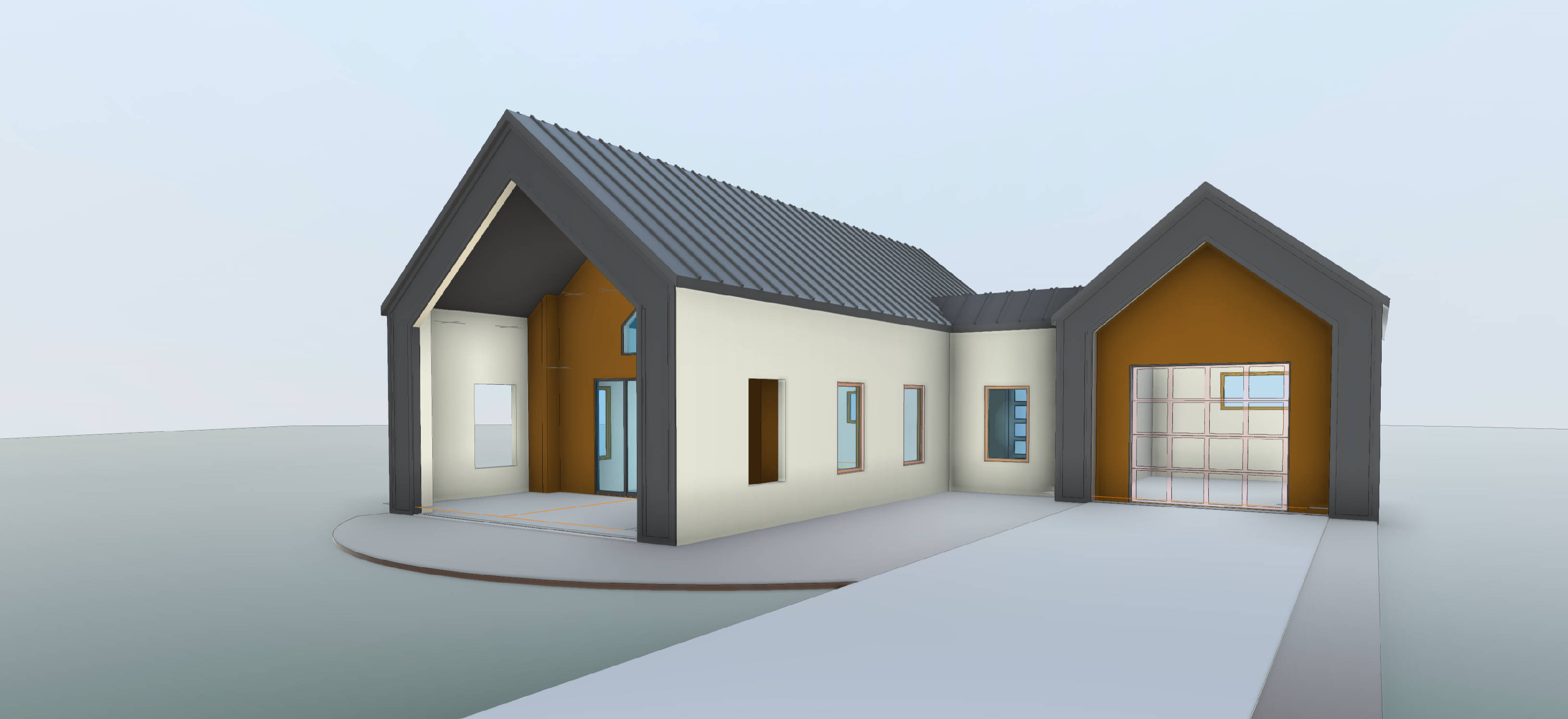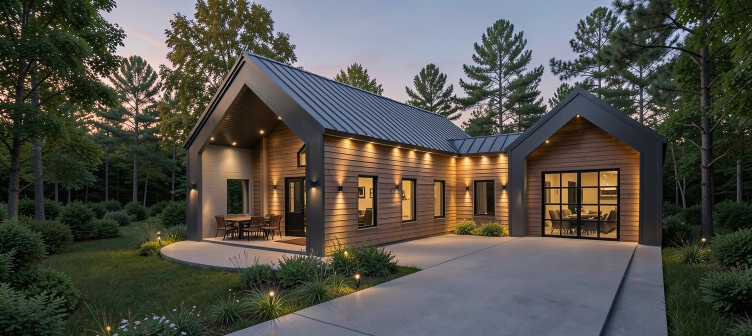 spring time almost evening harp lights black frames trees more realistic at the background show different height of trees inside the buildings show furniture the windows are darker the lights in landscape should be realistic and metal material show real lightings for landscape lights natural wood horizontal siding dark gray metal standing seam roof