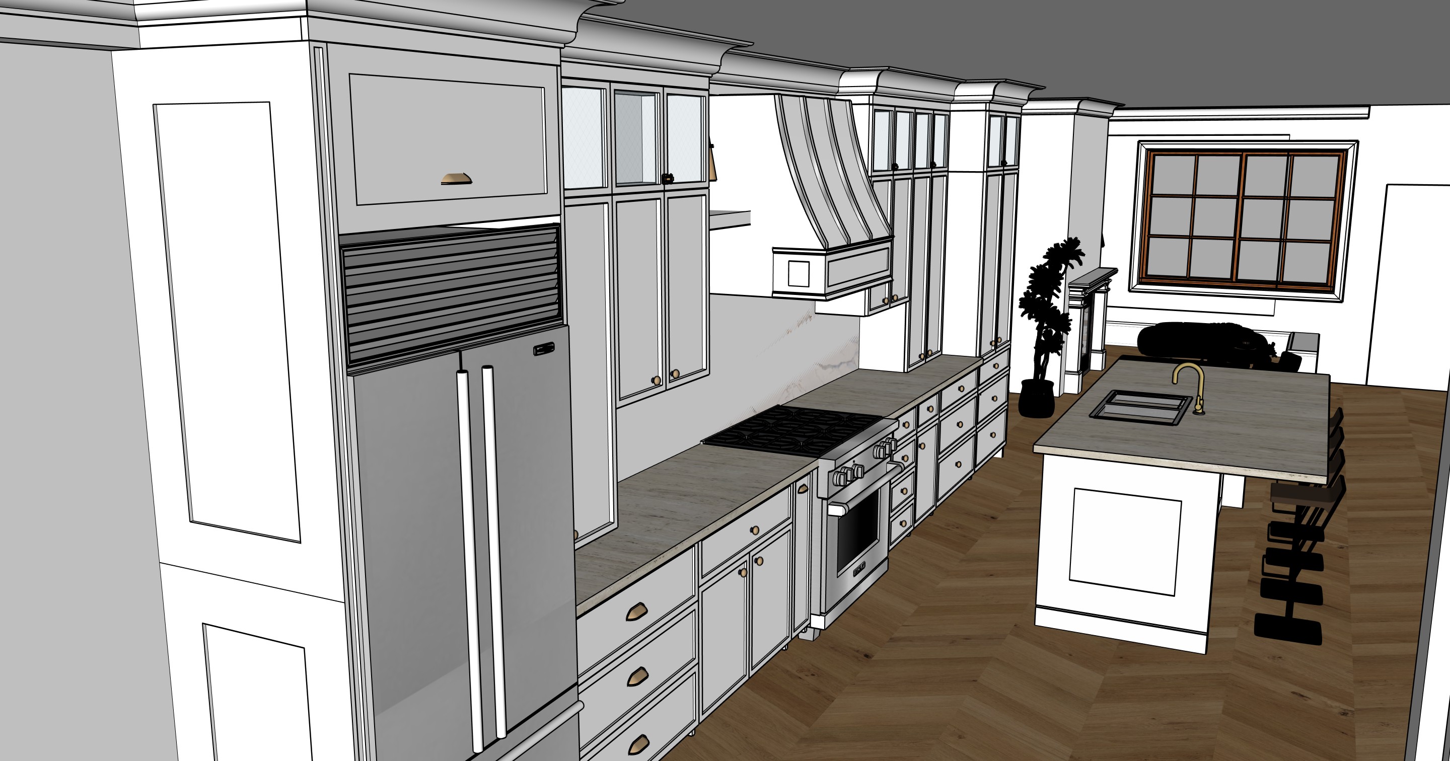 please render it in the farm house style the island is white face with travertine countertop kitchen countertop is also travertine the fireplace is not brick it s drywall finish there s no window beside fireplace and in cabinet range hood is no stainless steel upper cabinet on the top is glass door the fireplace area has crown moulding please add some lighting on the fireplace area kitche backsplash is calacatta gold flooring is oak herring bone please add pendant above the island backsplash is calacatta gold full slab please add some wainscotting pattern on the fireplace wall in addition to this