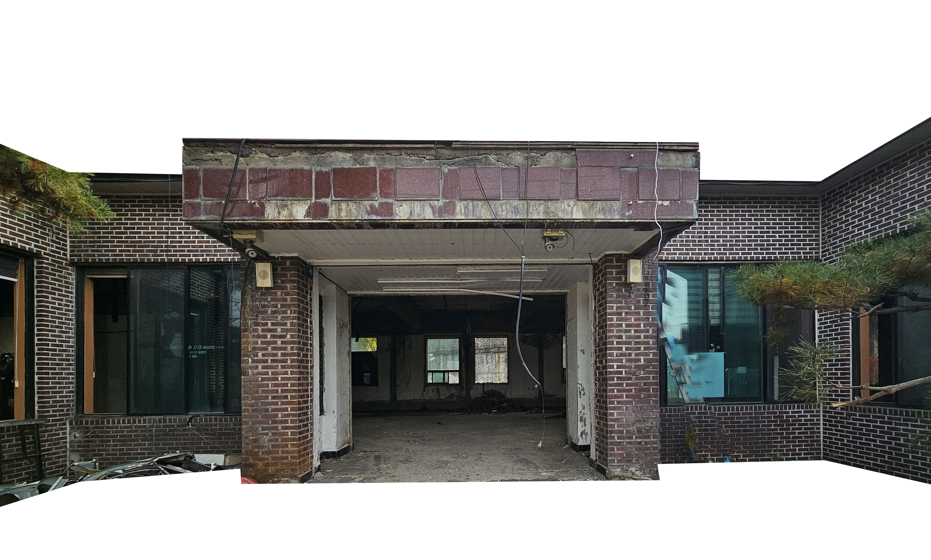 modern style industrial black frame canopy concrete keep the canopy column wall finishing white brick and plywood remove the arch the window is a fixed window frame the front yard has grass tiled roof removed outside finish applies white finish and wood finish only in the middle delete the roof make it modern the exterior of a modern chinese restaurant wood finish is applied to the entrance wall inside the doorway delete all the inside of the doorway and place the table at the chinese restaurant