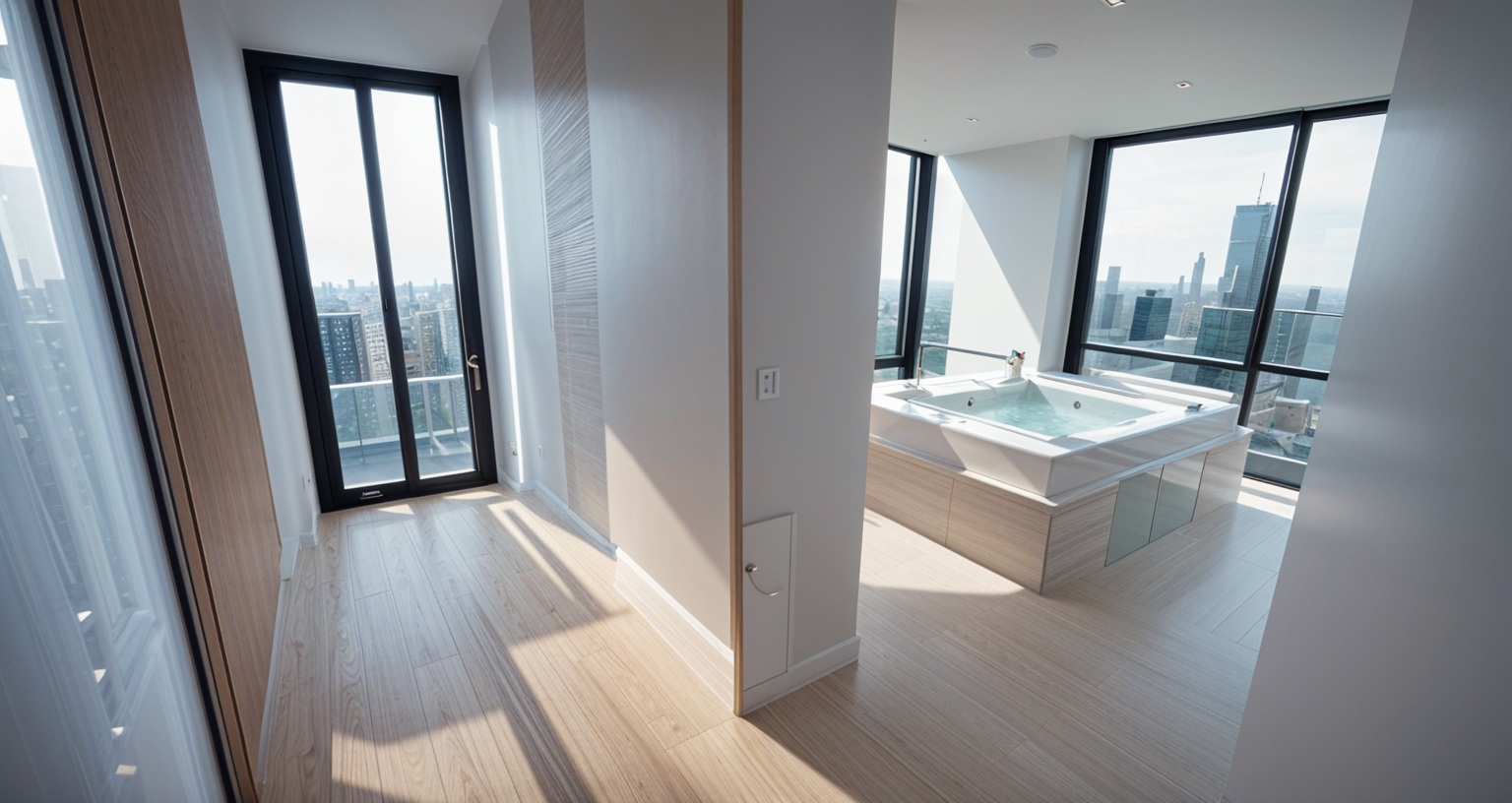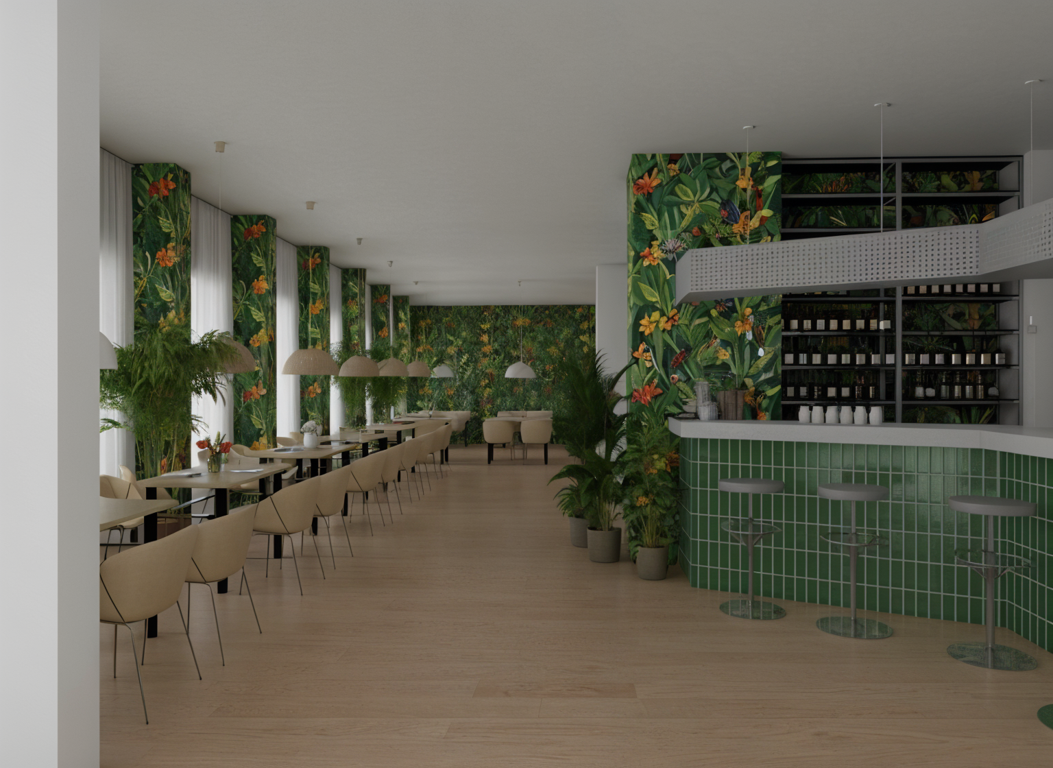 as a design expert please create a detailed visualization of a brazilian style tropical restaurant interior featuring abundant plants and colorful wallpaper maintaining the existing geometric layout include a bar with green vertical ceramic tiles barhocker and visible bottles and glasses behind it along the windows and back wall place tables with four chairs each on a polished subfloor ensure the design reflects a lush vibrant tropical ambiance with authentic brazilian elements