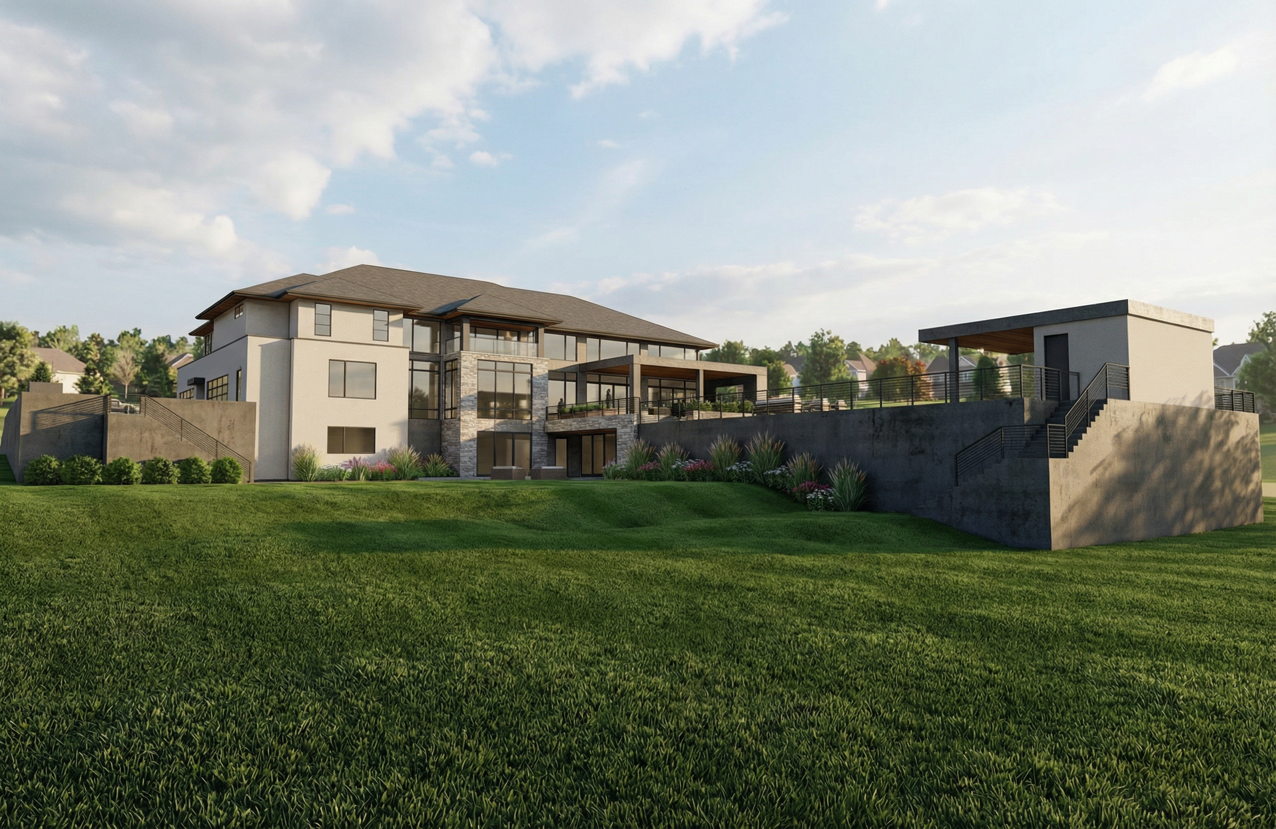 add more realistic materials vegetation and landscaping place building in a suburban setting with sky and light vegetation throughout the distance