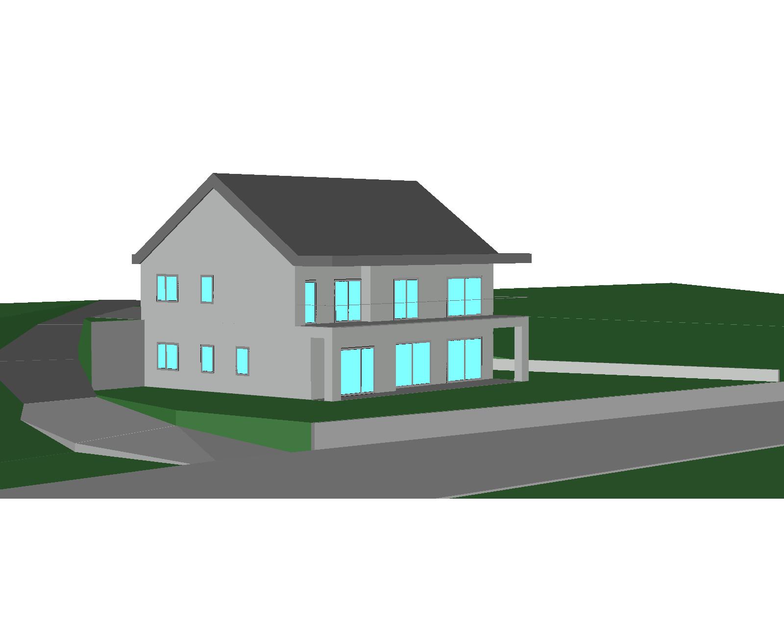 exterior shot white facade grass trees in the background no buildings more natural windows grey window frames summer vibe road below architecture