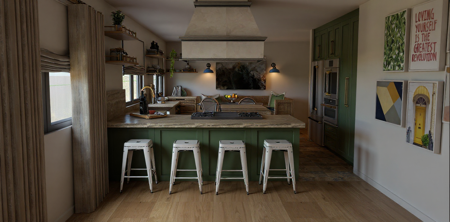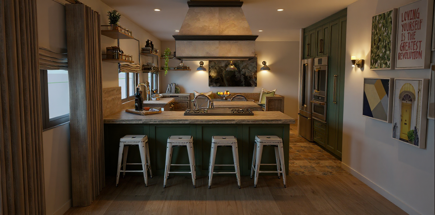 make bright afternoon lighting make photo realistic add window on back wall at make sconces light up