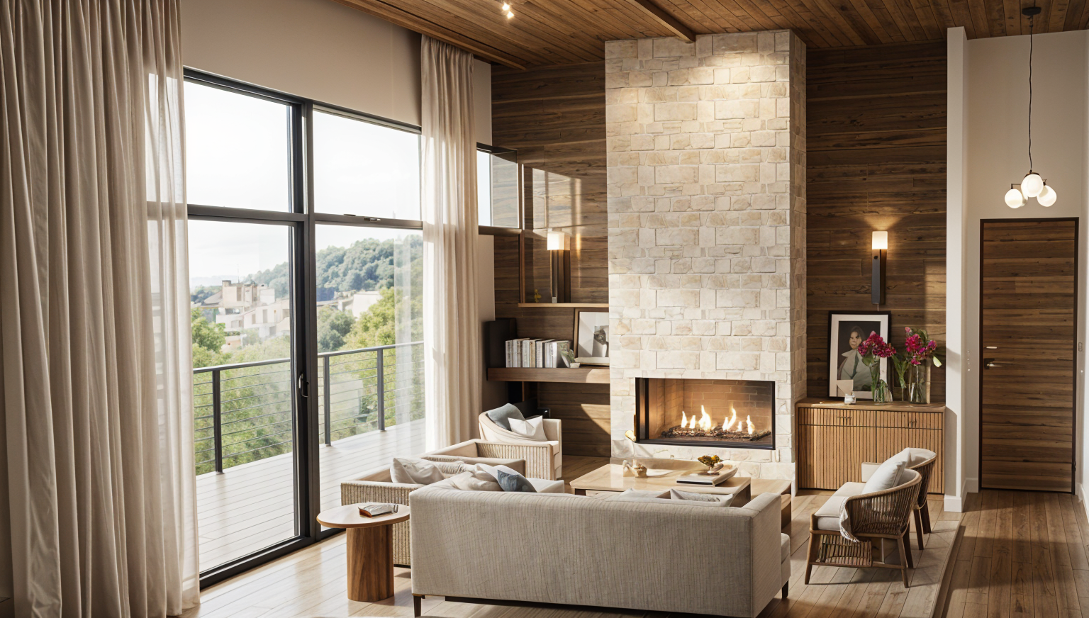 modern open concept architectural space with high ceilings featuring large windows overlooking a golf course letting in natural sunlight use soft neutral colors like light beige and cream for the walls and ceiling incorporate gentle shadows to highlight structural lines and add accents of soft greenery design a warm and inviting atmosphere with a focus on minimalism and spaciousness