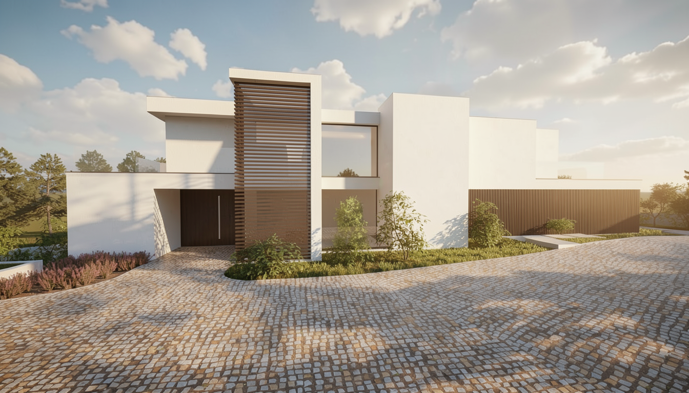 necesito que me crees un plano ilustrado como si fuese una acuarela en base a esta imagen de sketchup quitame la vegetacion dale menos luz hazlo mas ilustracion de dibujo dale mas sombras