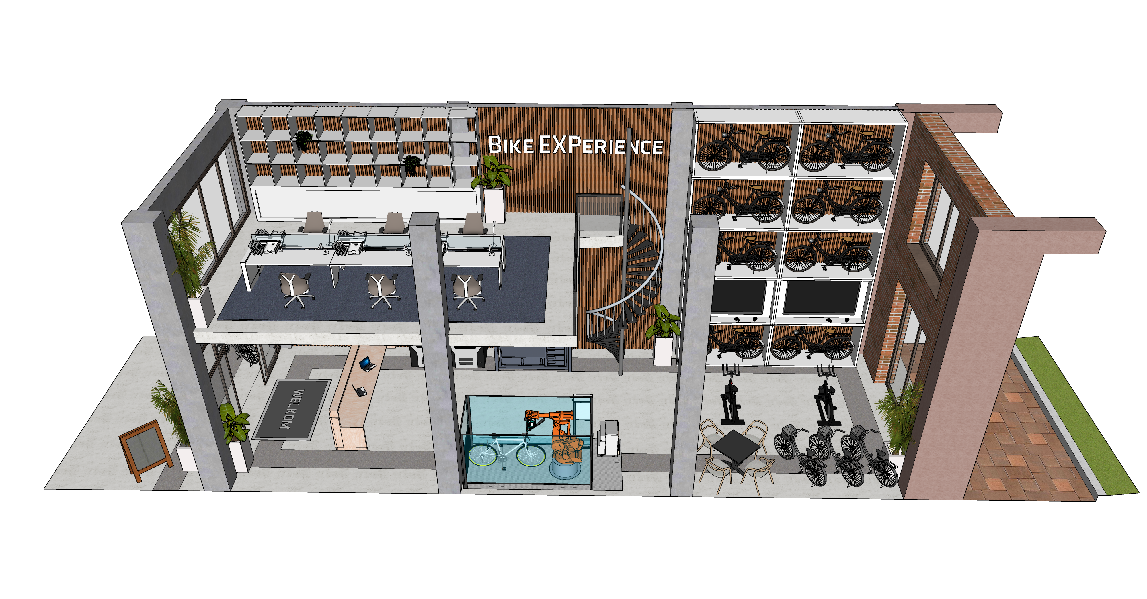 modernist exterior shot modern coworking makerspace warm morning light ambience light tones wooden details architecture