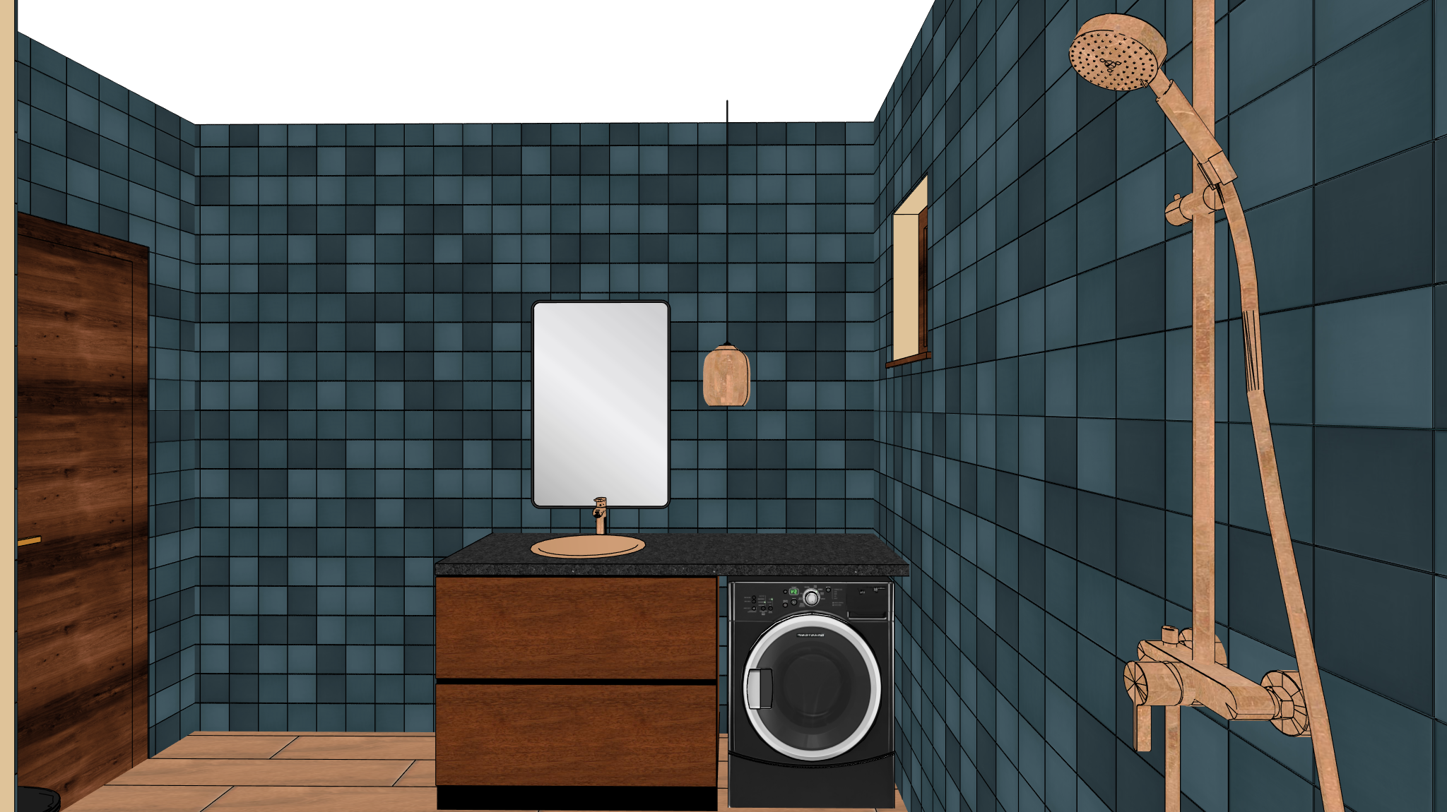 bathroom with bright teal organic tile and wooden plank style floor tile wooden bathroom cabinet with black toe kick and black inset handles black wahing machine quartz countertop copper sink and faucet above the sink there is a mirror with a black frame next to it on the right there is a copper ceiling light emmitting warm light on the right there is a small window where the natural light comes in and a copper shower faucet set on the left bottom corner we can barely see the edge of the black toilet there is a wooden door with a brass handle on the left the whole room is lit with warm and even light from spotlights on the ceiling