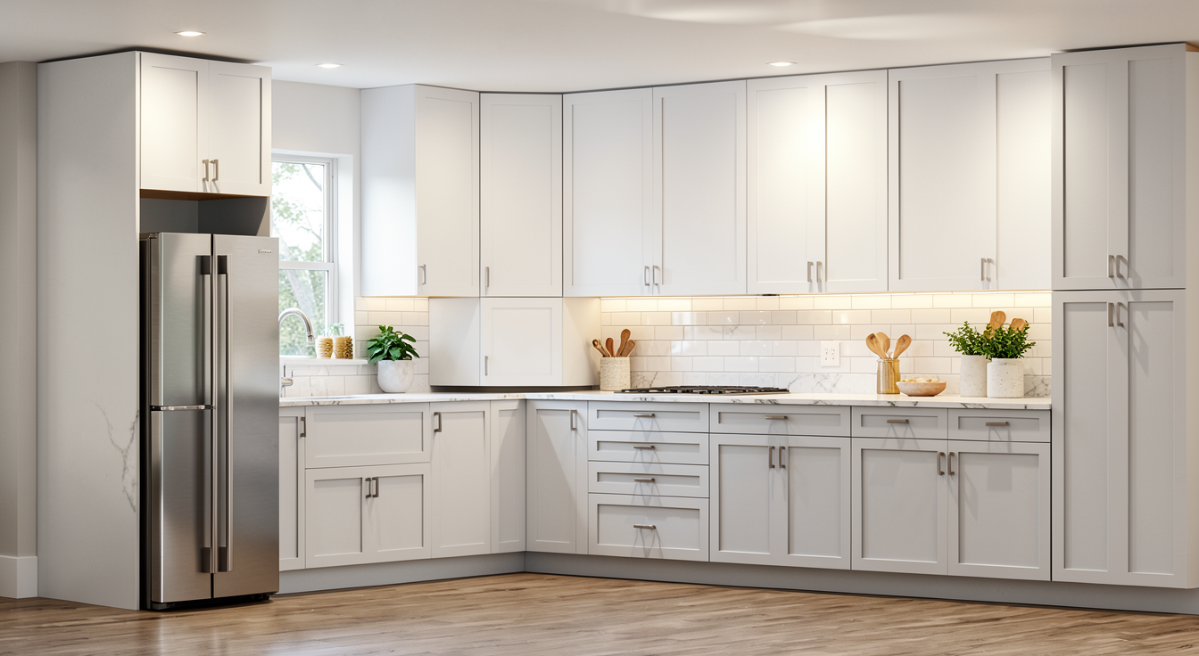 keep the same exact image but change cabinets to be all white and the style of the cabient in the fe