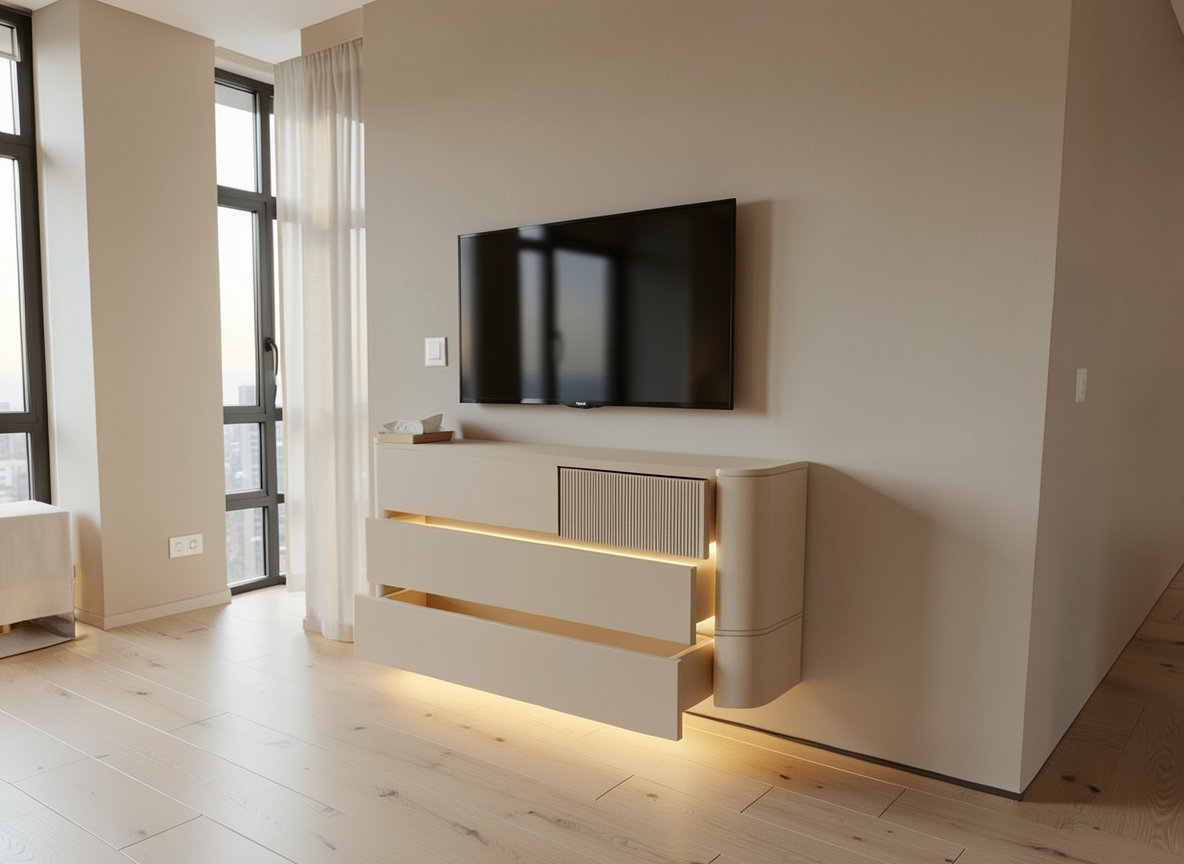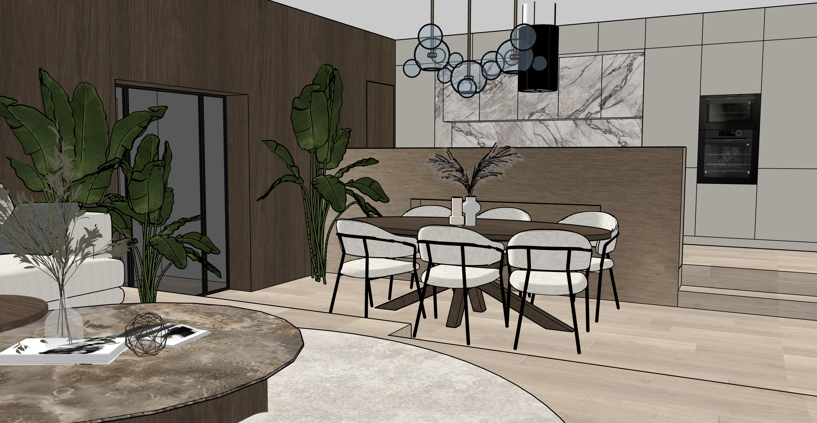 maintain the original color palette and material composition from the reference image but enhance all materials to appear highly realistic natural and physically accurate the wooden flooring has a brushed finish with visible natural grain texture it should feel authentic slightly bleached in tone with subtle tonal variation and a soft matte surface that reflects light gently the circular element on the main wall is a brown tinted mirror with integrated warm backlighting creating a soft halo glow around its edge the mirror should have depth and slightly warm reflections behind the sofa next to the mirror place elegant bronze decorative rods the bronze should have a refined metallic finish with soft realistic reflections not overly shiny but warm and sophisticated under the coffee table there is a cozy rug in a light beige color with a densely woven thick pile texture the fibers should look soft tactile and inviting with natural shadow depth the fireplace is lit with realistic natural flames that cast warm ambient reflections into the space above the fireplace the marble cladding is flaviker quarzite sky finish the marble should display elegant natural veining subtle cool grey and soft beige undertones and a refined polished stone texture with realistic surface reflection the wall plaster has a rough stone inspired texture with visible irregularities and depth handcrafted and slightly raw not smooth above the dining table part of a glass chandelier is visible the glass elements should have realistic reflections and warm light refractions adding elegance without overpowering the space curtains are made of natural linen fabric slightly textured soft and organically draped the kitchen cabinetry is finished in a light beige matte surface soft and elegant with a smooth non reflective texture the stone used for the kitchen countertop and the upper cabinets cladding detail is flaviker quarzite sky the stone should display natural quartzite inspired veining subtle cool grey undertones mixed with soft beige hues and a refined realistic stone texture with natural depth the island cladding including the niche detail is finished in a bronze decorative panel by kronospan the bronze surface should have a sophisticated metallic appearance with subtle brushed texture and warm reflections not overly glossy the door leading to the hallway located on the right side between the kitchen and the living room features a black metal frame with black clear glass infill the metal frame should have a slim elegant profile with a matte or satin finish the glass should appear slightly tinted but still transparent allowing subtle visibility through it through the windows a beautiful lush garden is visible green serene and slightly softened in depth of field to enhance realism and atmosphere the overall image should feel warm cozy and inviting use soft pleasant layered lighting a combination of natural daylight and warm ambient interior lighting gentle shadows realistic material rendering premium architectural visualization quality photorealistic output