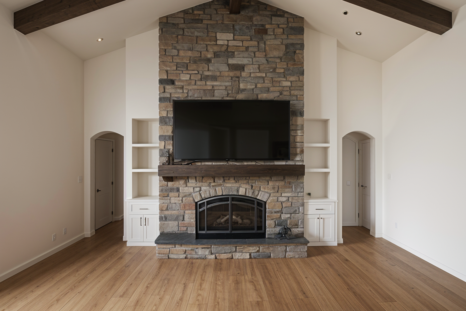 exterior shot change the stone to match the original and add it to the walls above the arch opening and above the bookcases
