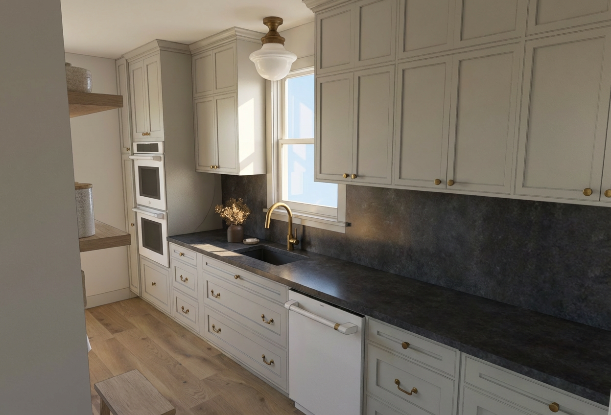 make this image photorealistic while keeping the exact layout materials colors and textures exactly the same material lock do not change the wallpaper pattern or colors keep the blue and tan floral wallpaper exactly the same keep the dark wood vanity color and wood grain exactly the same keep the brass fixtures and hardware finish exactly the same keep the white and gray floor tile exactly the same keep the marble countertop and backsplash exactly the same keep the painted wall color and trim color exactly the same do not redesign anything do not change any materials do not change any colors do not change any textures only improve realism by adding warm interior lighting realistic shadows reflections global illumination and realistic material textures add recessed ceiling light glow soft sconce lighting and realistic glass reflections the final image should look like a real interior photograph of this exact bathroom not a redesigned version