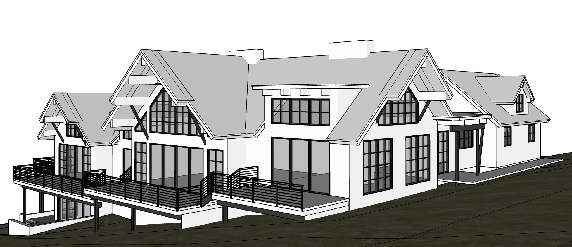 exterior shot mountain modern dark siding and materials winter scene dense pine forest architecture