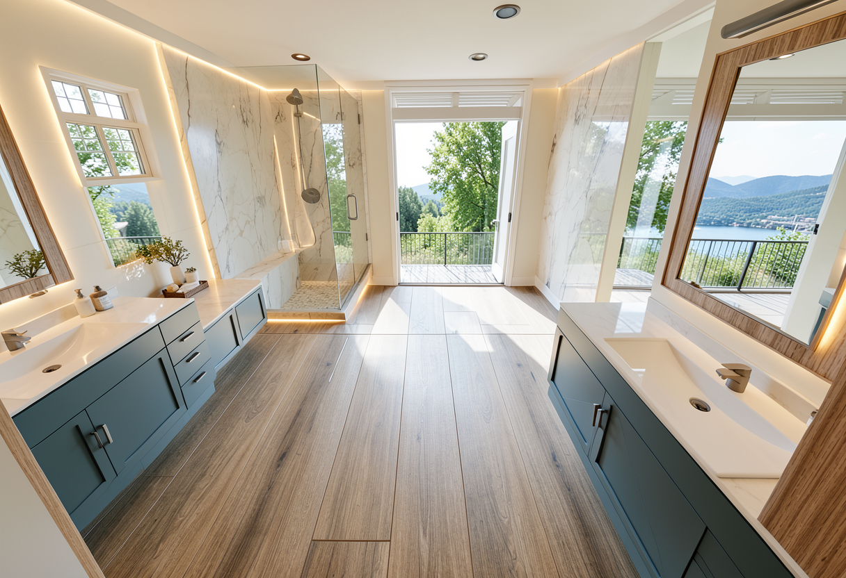 do a photorealistic rendering of the front of this house use rich warm wood siding dark stucco and white stacked stone soffit and fascia are black window frames are black show lush landscaping this house should look upscale and exhibit a modern design with warm welcoming colors