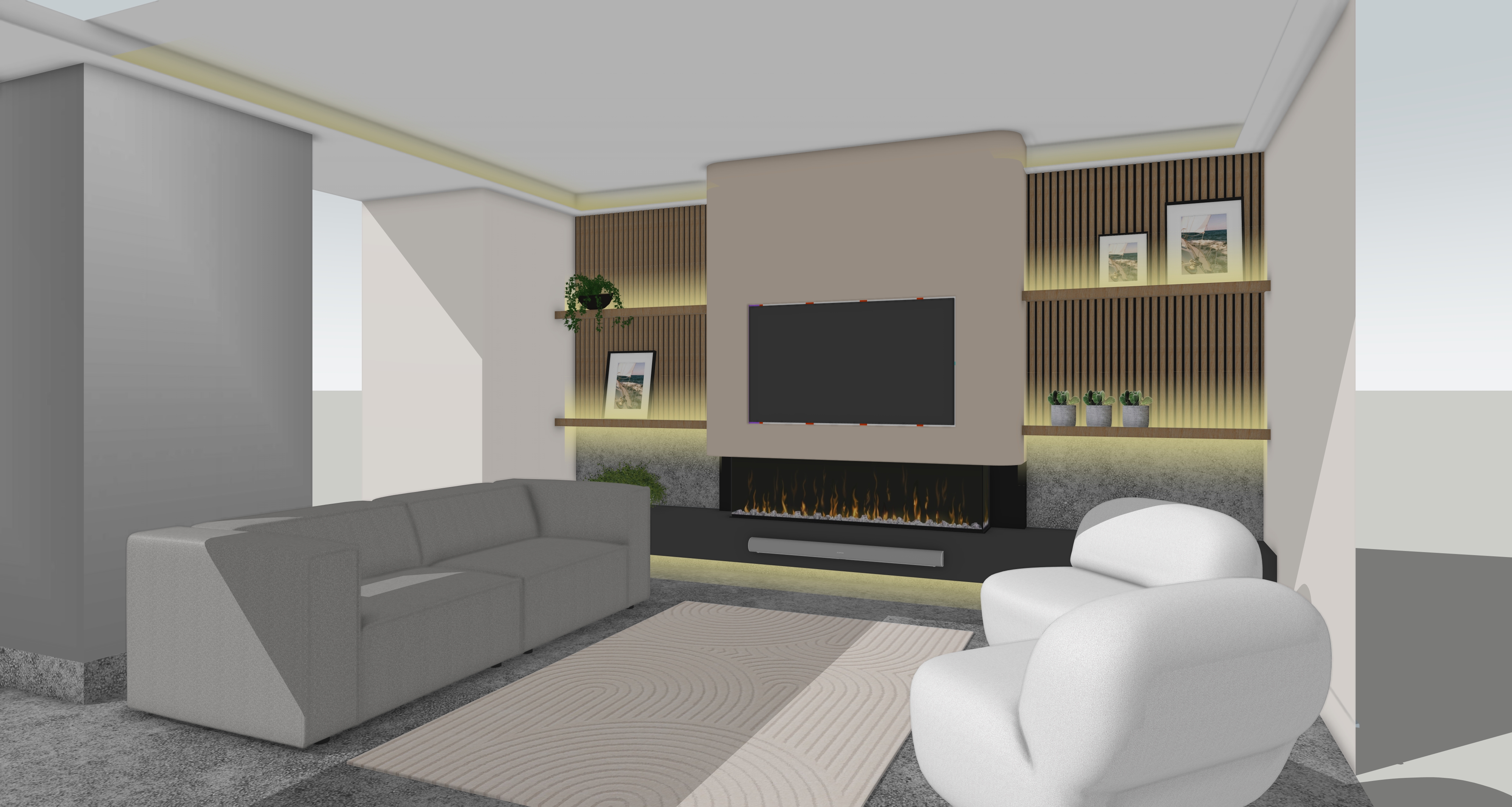 create a hyper realistic interior from this image without changing the original geometry the white chairs are boucle fabric the floor is polished concrete the sofa is a grey fabric as shown led warm white soft lighting as indicated in the original image areas only