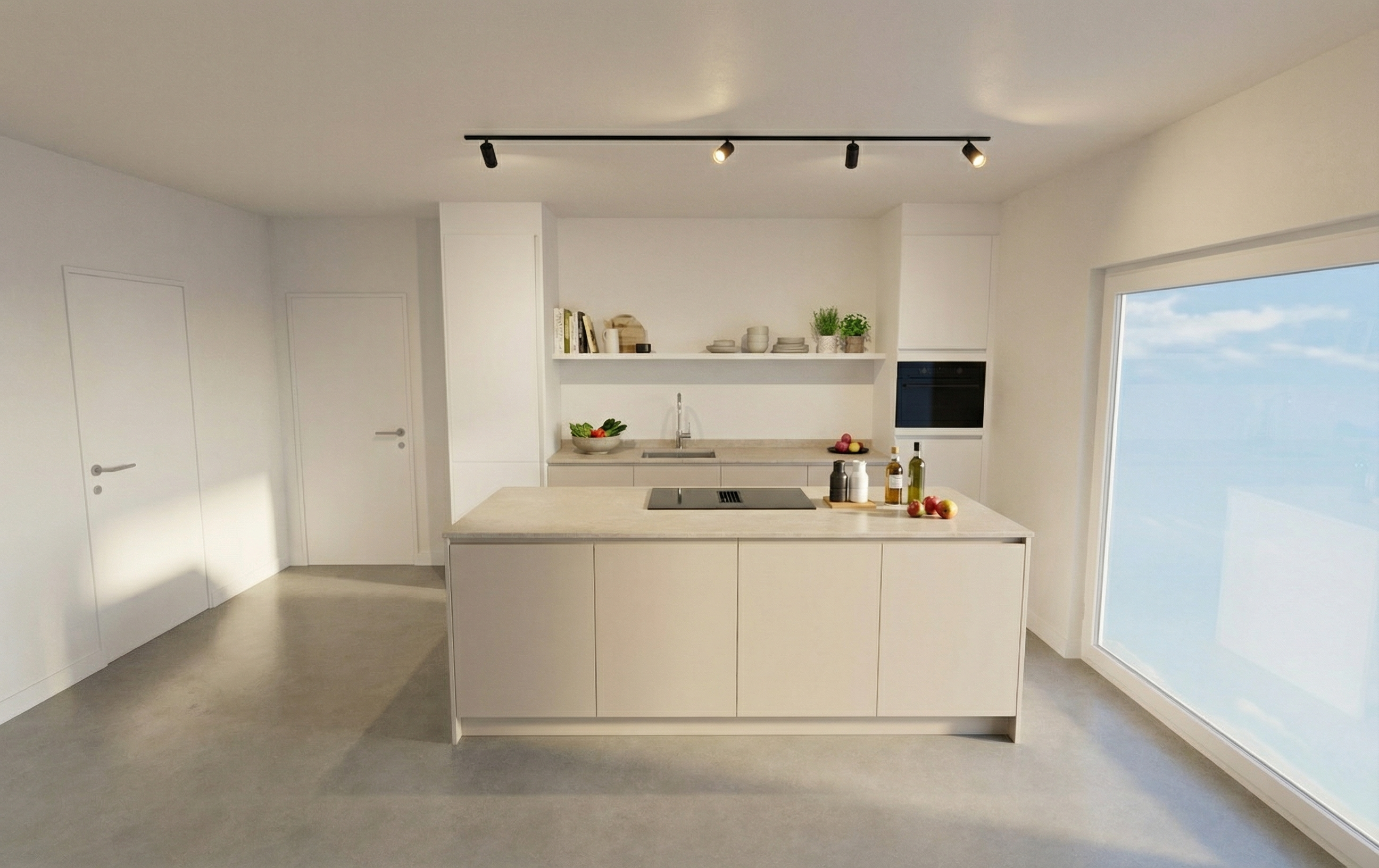 genau dieses rendering berarbeiten fotorealistisches innenraum foto exakt dieselbe perspektive und kameraposition wie das hochgeladene referenzbild 100 identische raumgeometrie exakt gleiche m belanordnung weiches nat rliches tageslicht leicht schr g einfallende sonne ganzer raum zus tzlich k nstlich ausleuchten sanfte realistische schatten blickrichtung ist nach osten sonnenlicht kommt von s den realistische materialien echte holztexturen stoff mit leichten gebrauchsspuren hochwertige oberfl chenreflexionen lavabo inklusive unterbau aus marmor collemandina grigio in braungrau dunkel im unterbau im obersten drittel eine griffmulde ber die ganze breite hinter dem lavabo eine vola wandarmatur edelstahl vollkommen rahmenloser und bis auf f nf zentimeter versenkter und hinterleuchteter spiegelschrank links neben dem lavabo ist die dusche thermostatmodul axor select mit stabhandbrause und grosser wandtellerbrause vertikales led ber die ganze raumh he ganz links hinten in der dusche w nde in der dusche und boden collemandina grigio in braungrau alle anderen sichtbaren w nde sind sichtbeton die toilette ist in der nische hinten auf der rechten seite moderne toilette vertigo wandh ngend in farbe weiss matt tecelux bet tigungsplatte toilettenpapierhalter in edelstahl an der wand links von der toilette an der grossen wand handtuchradiator in edelstahl an der fl gelwand auf der rechten seite schwarze steckdose rechts vom lavabo schwarze runde deckenspots in der nische vorne rechts ist die unsichtbare installationszone sehr moderner minimalistischer look nat rliche farbwiedergabe golden hour feeling das bild muss wie eine professionelle fotografie aussehen es soll ein echtes und reales foto sein canon eos r5 35 mm festbrennweite f 2 8 hyperrealistisch dslr qualit t raw aufnahme 8k aufl sung extrem scharf perfekte tiefensch rfe professionelle architekturfotografie