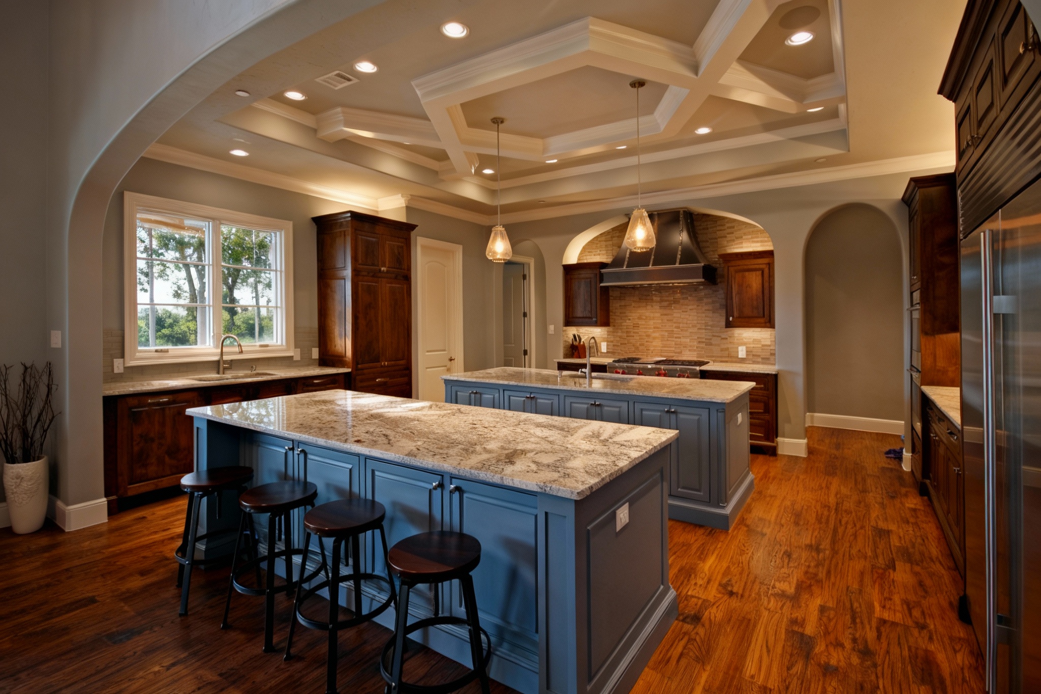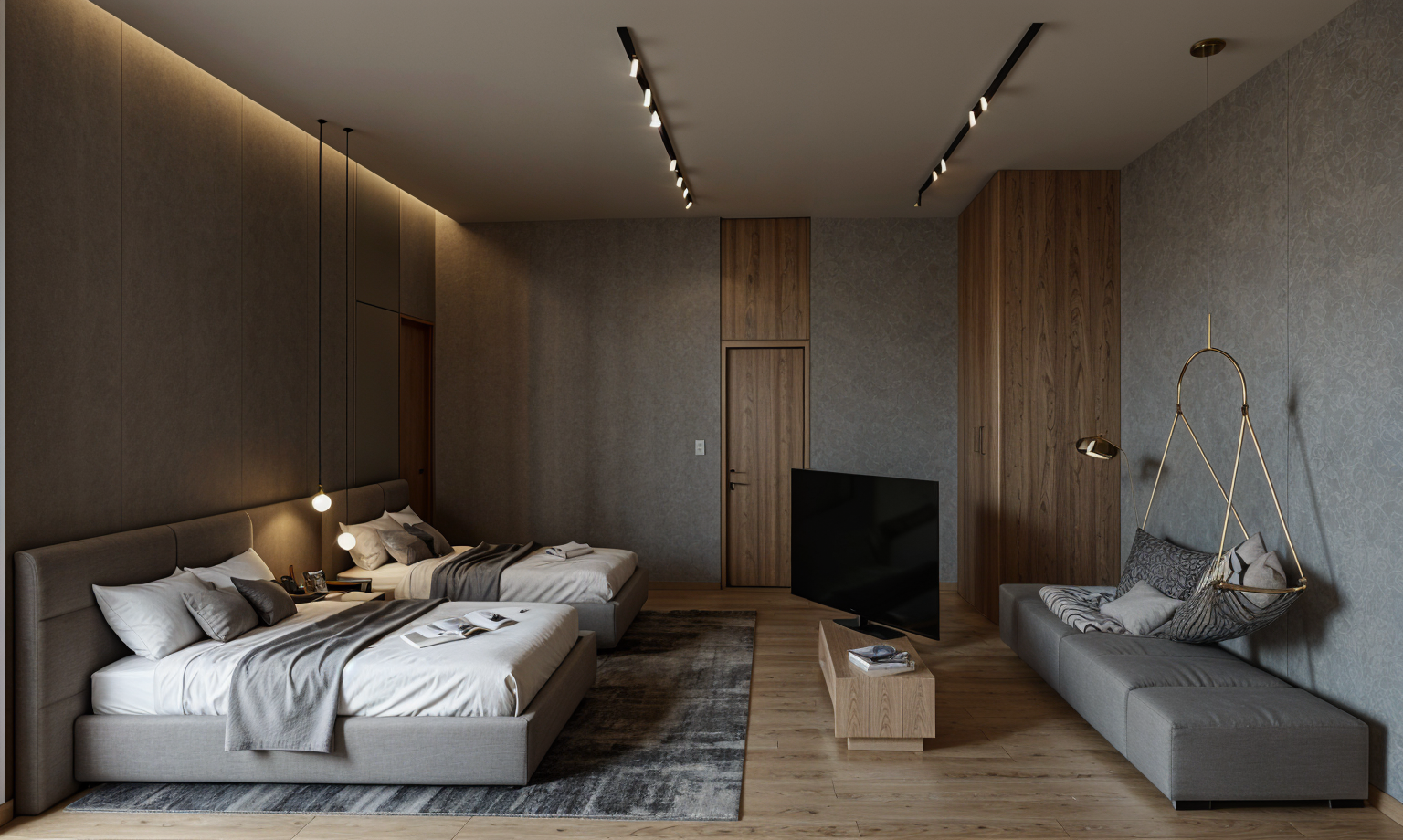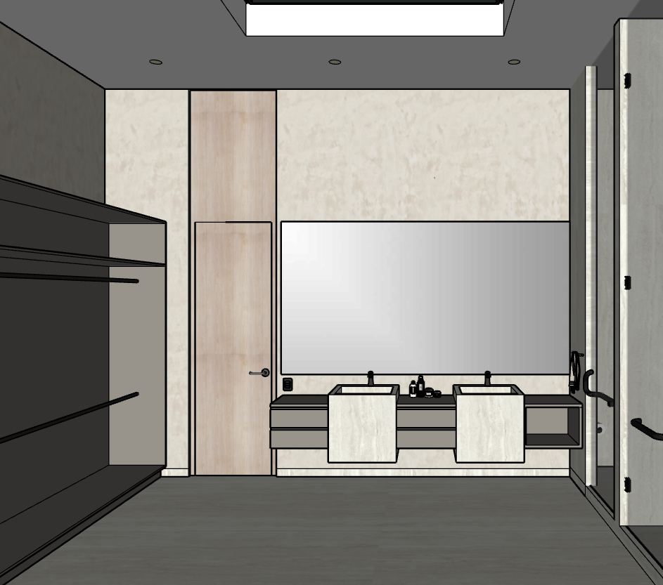 render a modern bathroom with a serene and elegant atmosphere use natural beige for the walls warm oak tones for the door and sleek charcoal gray for the surfaces and fixtures the floor should be a muted slate gray add a large glossy mirror above the sinks reflecting soft ambient lighting include matte black accents for handles and taps and a subtle warm white light illuminating the room ensure a clean minimalistic design for a luxurious and calming aesthetic