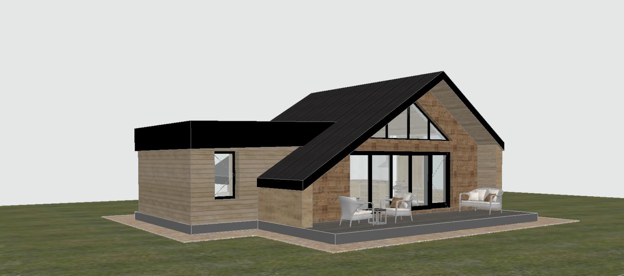 modern cabin in a serene landscape featuring a cozy angular wooden structure with contrasting black sloped roof and trim the wood is a warm natural oak color providing an inviting texture against the green grass surroundings large glass windows allow for ample light to flood the cozy interior the patio hosts elegant white outdoor furniture creating a perfect balance between modern and rustic the atmosphere is peaceful with soft natural lighting that enhances the colors conveying a sense of tranquility and modern elegance