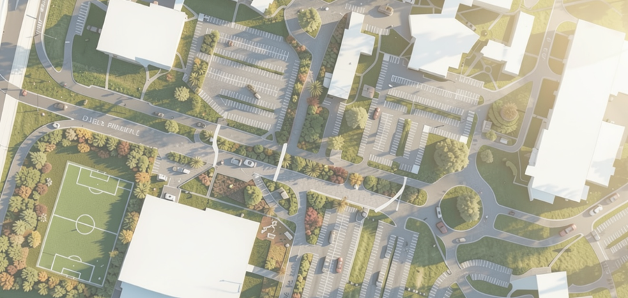 using my existing plan as the base enhance the area while strictly preserving the original layout scale road geometry and building positions maintain the same camera angle and perspective replace all existing pedestrian crossings white crosswalk lines with elevated pedestrian bridges crossing above the roadway these overpasses should allow pedestrians to move safely without interrupting vehicle traffic design the pedestrian bridges with a clean and contemporary architectural style ensuring they integrate harmoniously into the campus environment include access ramps or stairs and use materials such as wood steel or concrete to create a high quality and realistic appearance ensure the roads remain uninterrupted with no at grade pedestrian crossings maintain clear separation between pedestrian and vehicle circulation keep the rendering professional and clean with minimal or no people and no vehicles if not required focusing on design clarity and spatial organization