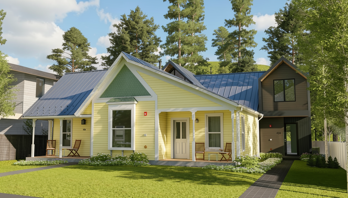 photorealistic architectural visualization design phase commercial modular bathroom pod accurate real world scale maintain overall pod footprint and height preserve wall thickness and structural logic add three identical exterior entry doors along the front elevation doors are evenly spaced and symmetrically aligned each door is standard commercial size 36 inch wide 80 inch tall doors are flush with exterior wall plane realistic construction methods clean geometry no artistic distortion no exaggerated proportions neutral exterior materials clear daylight lighting