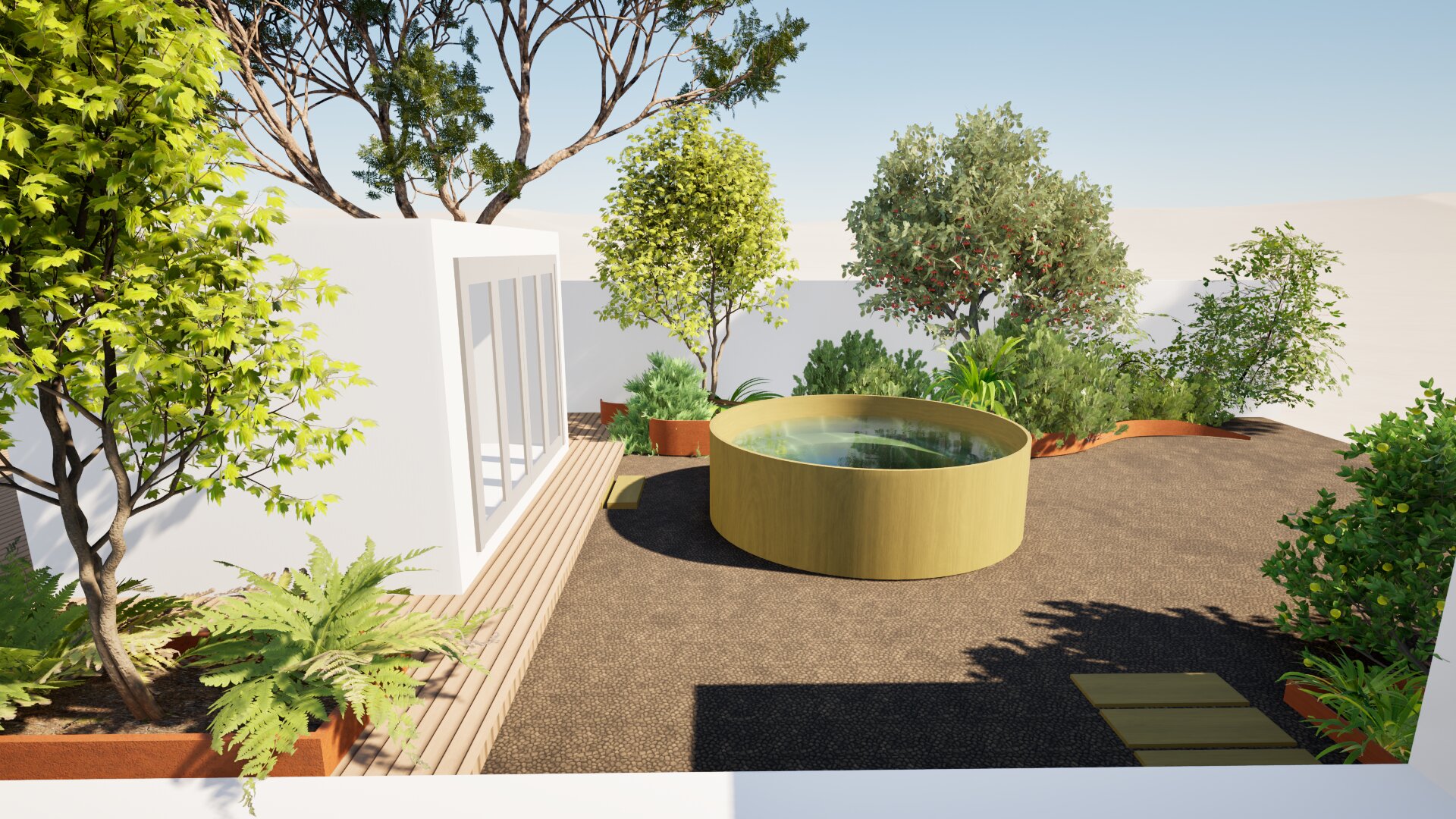 add flagstone steps around the cedar hot tub and around the dirt area of the yard additionally strategically place the following plants around the yard so that it creates a cohesive planting design lastly add some cobble stones and small boulders to create a nice japanese style garden aesthetic plant list acer palmatum sango kaku pinus thunbergii thunder head carex pansa japanese painted fern