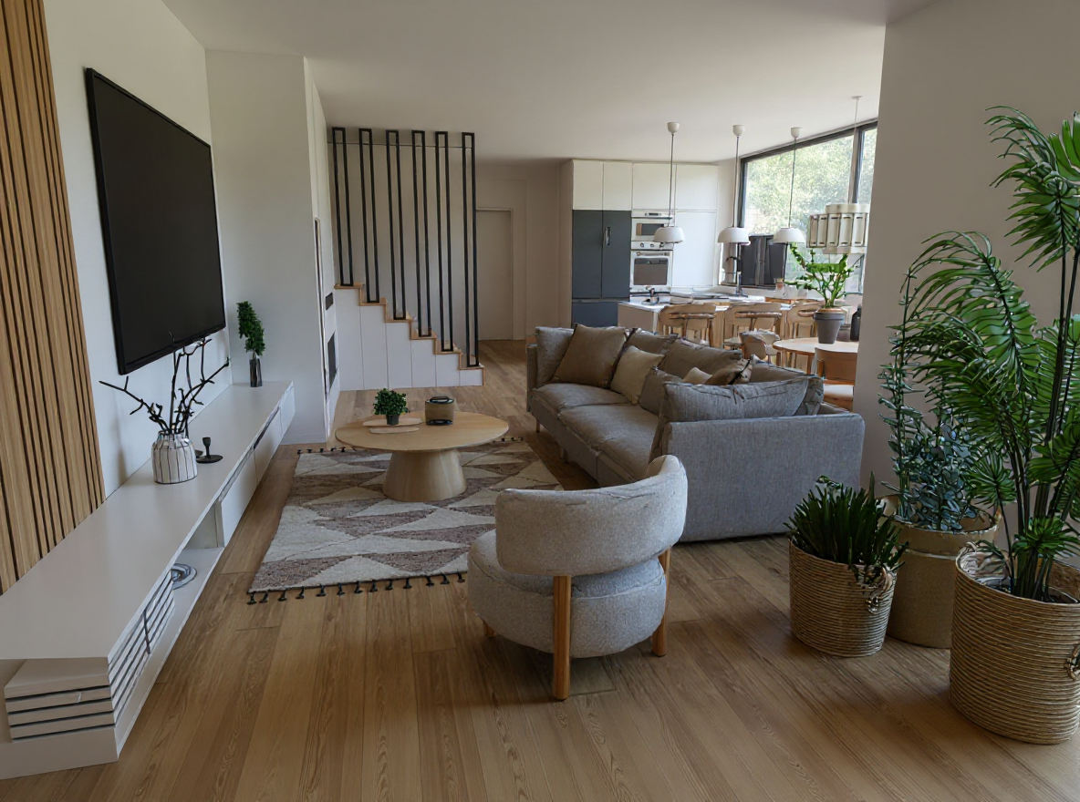 can you add a petite russian model sitting on the sofa facing towards the right away from the camera