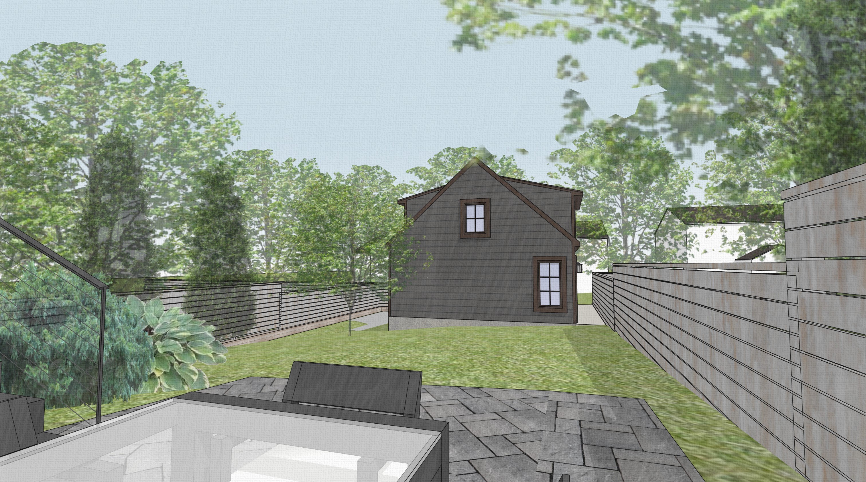 realistic greige siding with dark brown trim light wooden fence full green landscaping