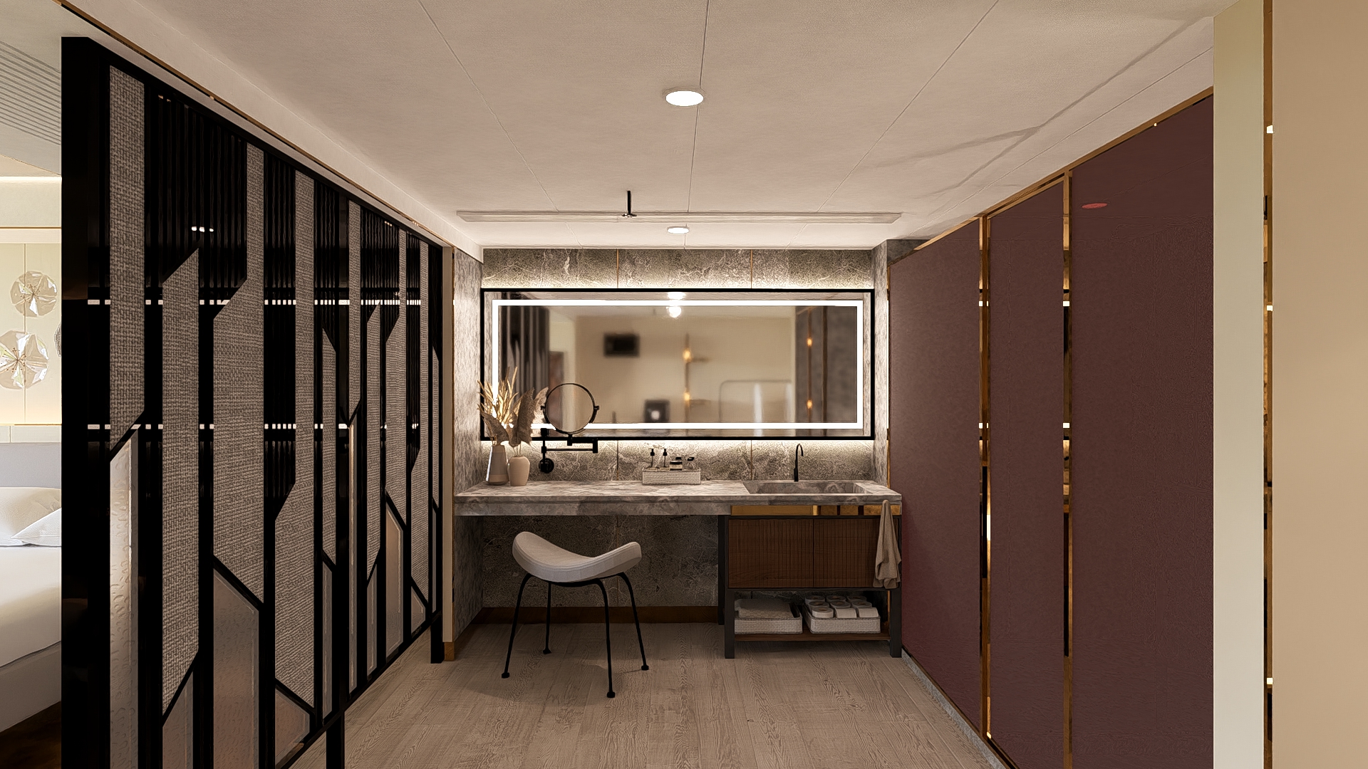 maintain the overall geometries just change the type of sink water basin generate me a design of the sink wash basin that best suits the interior
