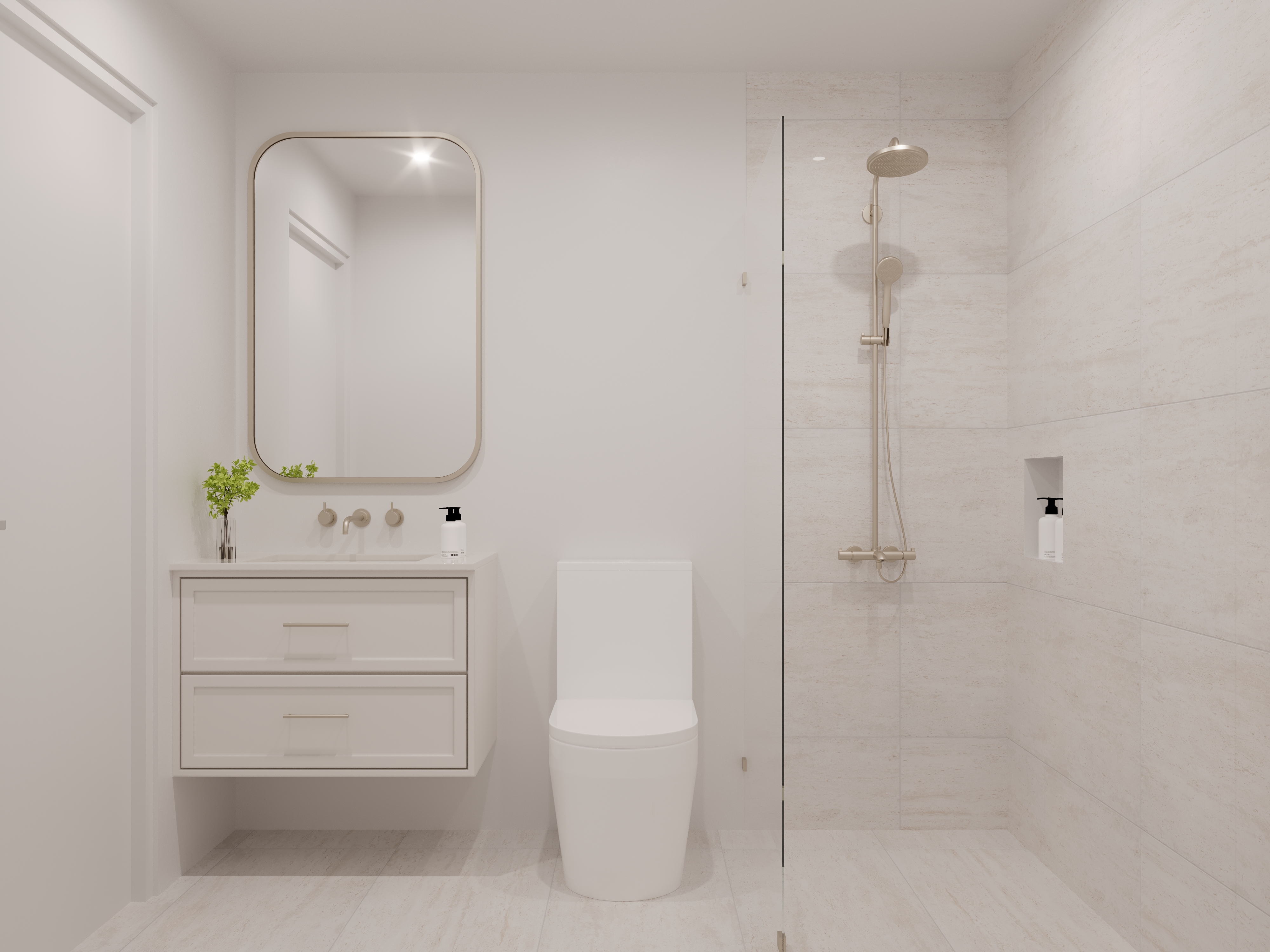 can you redo this image with darker tones perhaps concrete and darker brown finishes tiles cabinetry etc to provide a slightly darker option for buyers keep the brass taps and handles