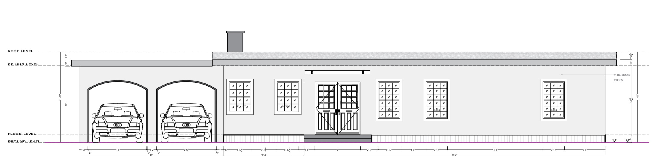single story house with white stucco walls loak trim and doors white windows two car garage with arch oepeings yard should be gravel with a agave and lavander feild path lights and path leading up to the front door pathway to the front door should be 1 foot from the driveway path should be 7 cement pads measuring 2 x 4 ft make the cars black range rovers stucco cinder block wall from far left side of the garage toward street