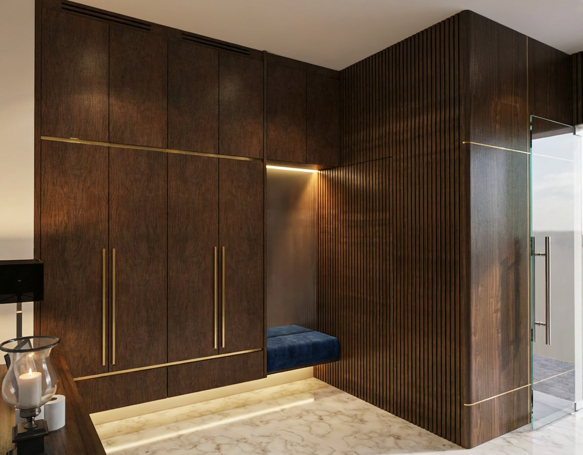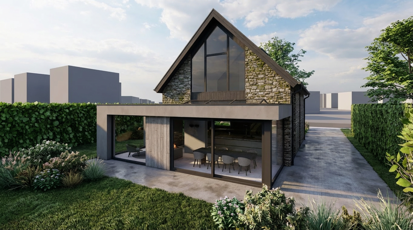 high detail architectural photograph of the specific modern house in the image viewed from the same angle strictly adhering to the original material locations the dark grey integrated gutters and downpipes follow the eave and chimney lines precisely all windows are highly transparent with subtle deeply shadowed interiors the lawn is dense and textural context buildings remain simple geometric blocks lighting is a soft warm natural daylight subtly veiled by light wispy scattered clouds serene photorealistic atmosphere highly detailed textures