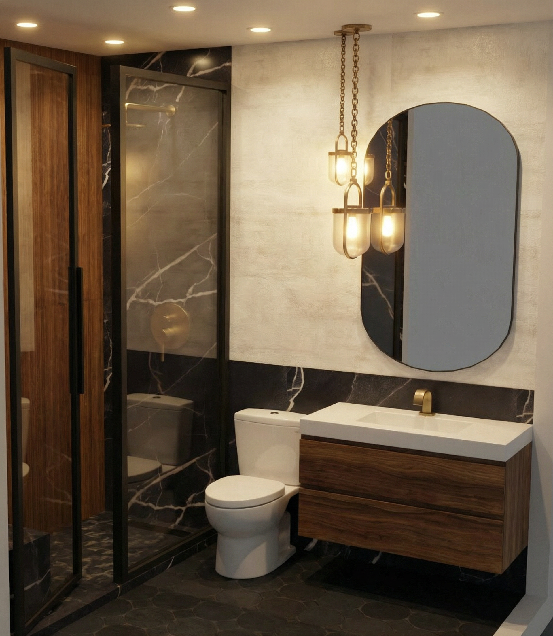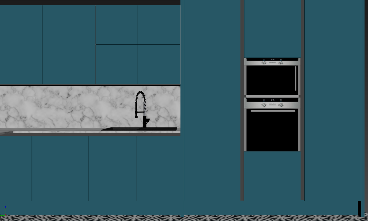 4k render warm lighting neff ovens the tap is black led lighting hidden under wall cabinets the worktop is calacatta white with not too much contrast kitchen units are dark blue navy but not too dark
