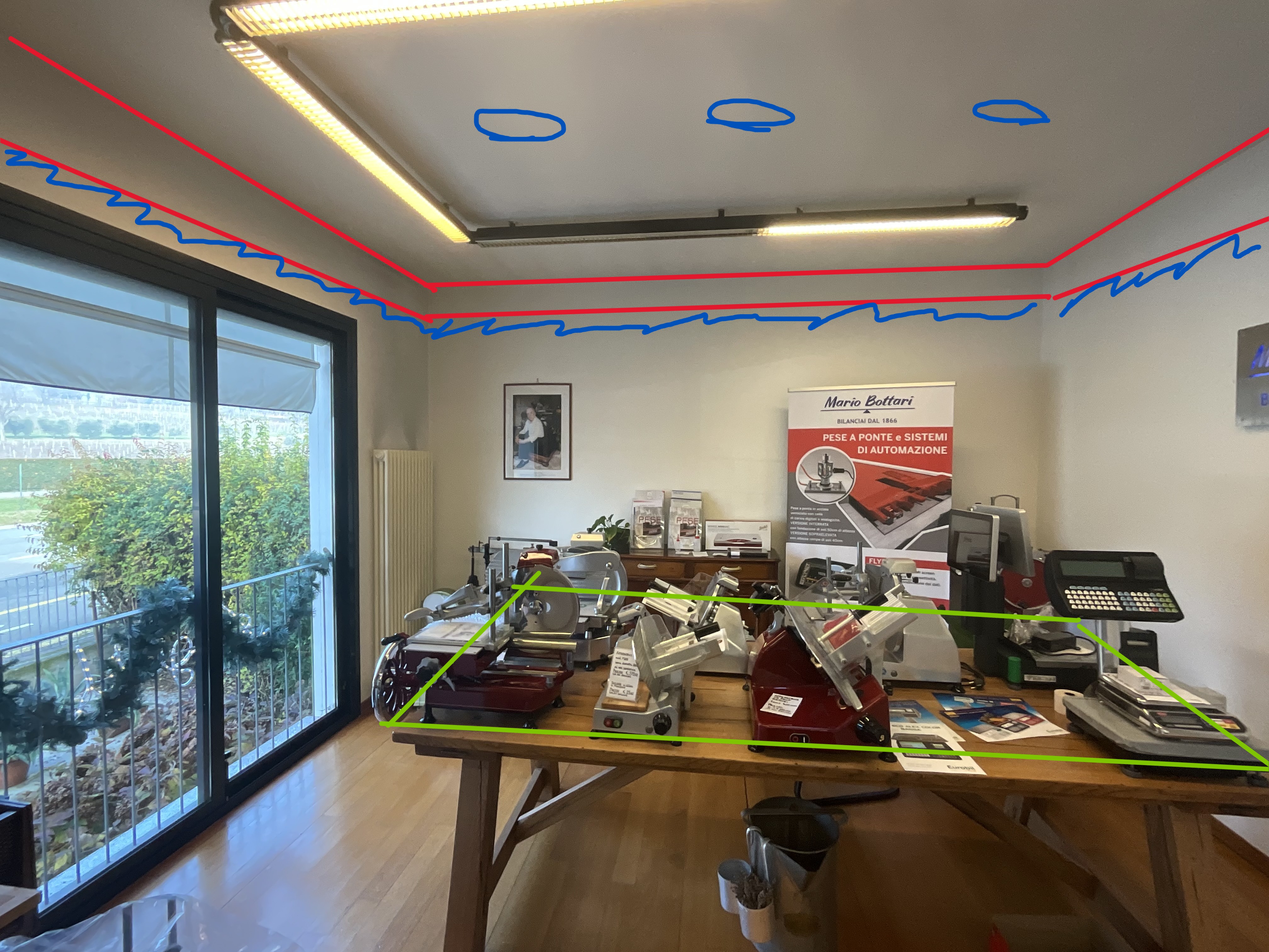 modernist exterior shot rendimi questa stanza un ufficio di design dove ci sono le linee rosse voglio una controsoffitto con i led mentre dove ci sono le linee blu dei faretti voglio pavimento in legno la tavola centrale deve essere in legno con dei posti a sedere su ogni lato architecture