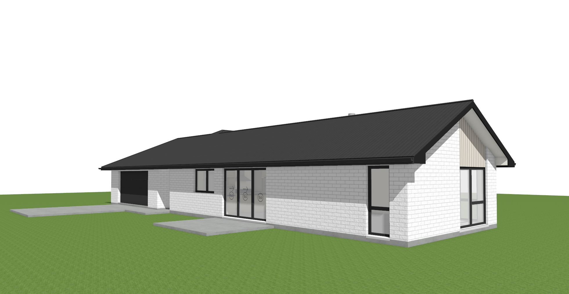 white brick grey wood with a concrete driveway and fencing short grass