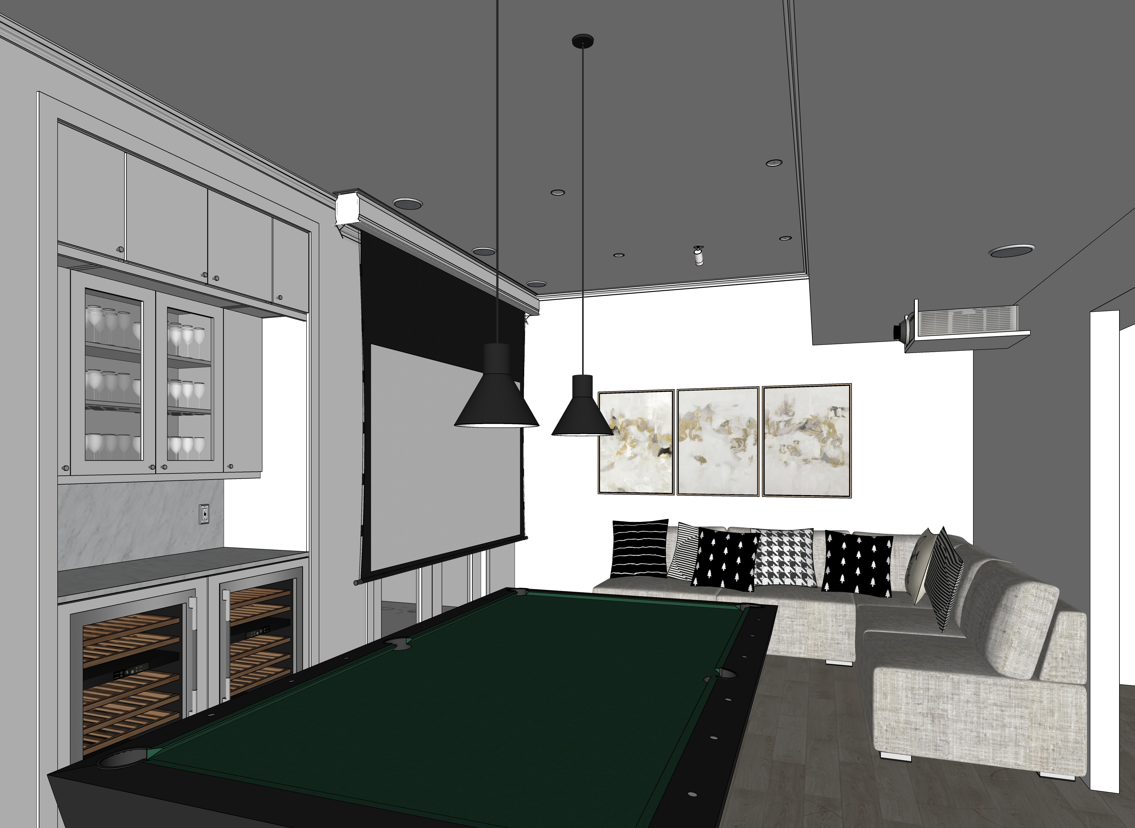 use the source image for the scene do not add any new elements to the rendering keep the ceiling whit evening lighting in the space add lighting inside the glass cabinets with the wine glasses add lighting on the marble countertop add a wine and cheese platter on the marble countertop add wine bottles inside the two wine refrigerators make the view to the outside through the french doors dark with some lights on from a condo building next door add a man a playing a game of with a woman next to him waiting to take a shot with balls randomly arranged on the table add more light on the table the walls are painted white add light coming from the recessed fixture in the upper left corner of the view the door and window frames are painted white show a music video from kendrick lamar on the screen at the right side of the view show glass doors in the center cabinets with the wine glasses inside only bring the room light level down a little bit keep the light effect over the pool table and inside the cabinets show the upper cabinets with solid doors