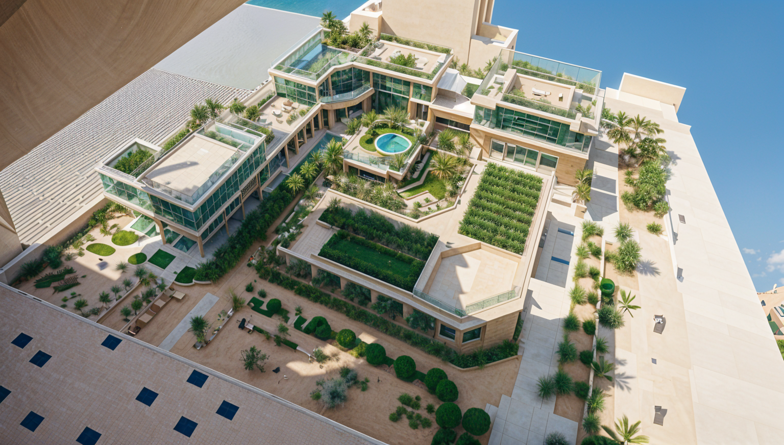 shopping center sand stone shop facade column and window facade palm trees greenery green roof cafes around architecture