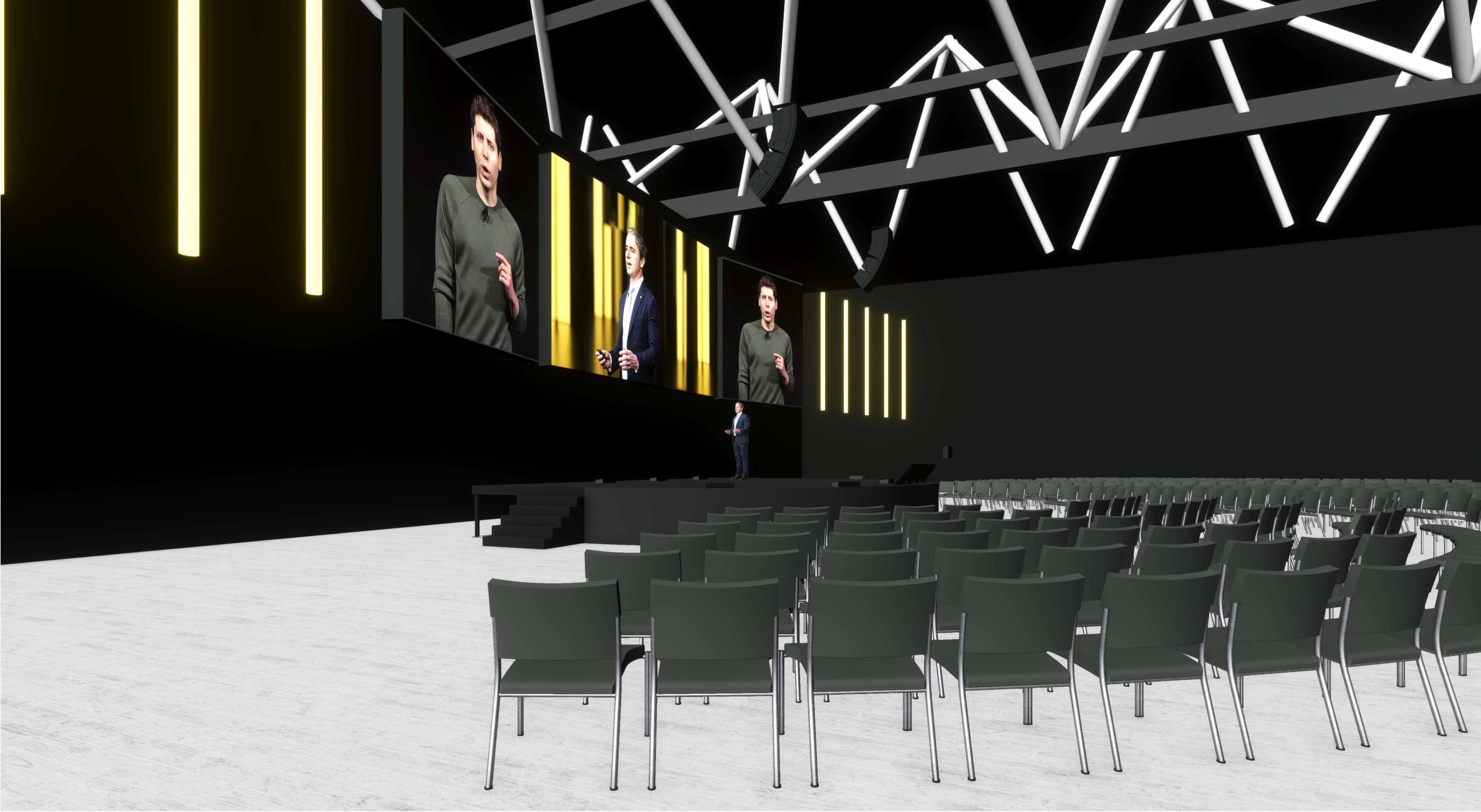 a dark immersive stage environment with an oversized suspended led screens and light tubes behind him illuminated glowing yellow black drapes to perimeter add business people in smart casual work clothing in the audience