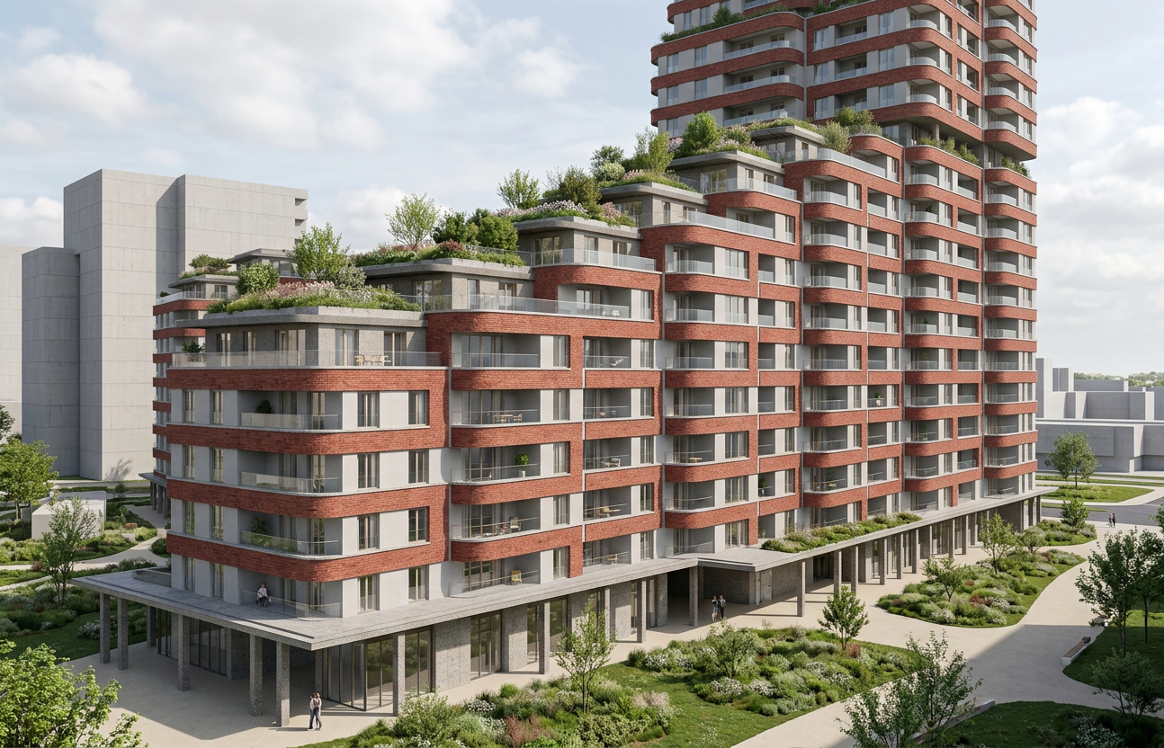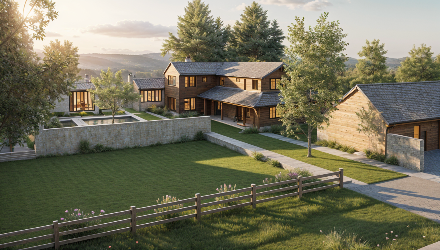 a serene countryside estate with lush greenery and elegant architecture render a charming house with light gray stone and warm wooden accents the roof is a soothing slate gray surround the house with vibrant green hedges and trees adding depth with lush shadows the foreground features a rich brown wooden fence enclosing well manicured lawns of emerald green grass a quaint wooden garage with a terracotta roof adds rustic charm set against a clear sky with a gradient from azure blue to soft white at the horizon creating a peaceful idyllic atmosphere
