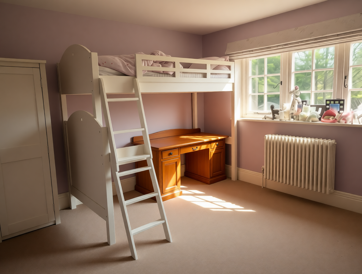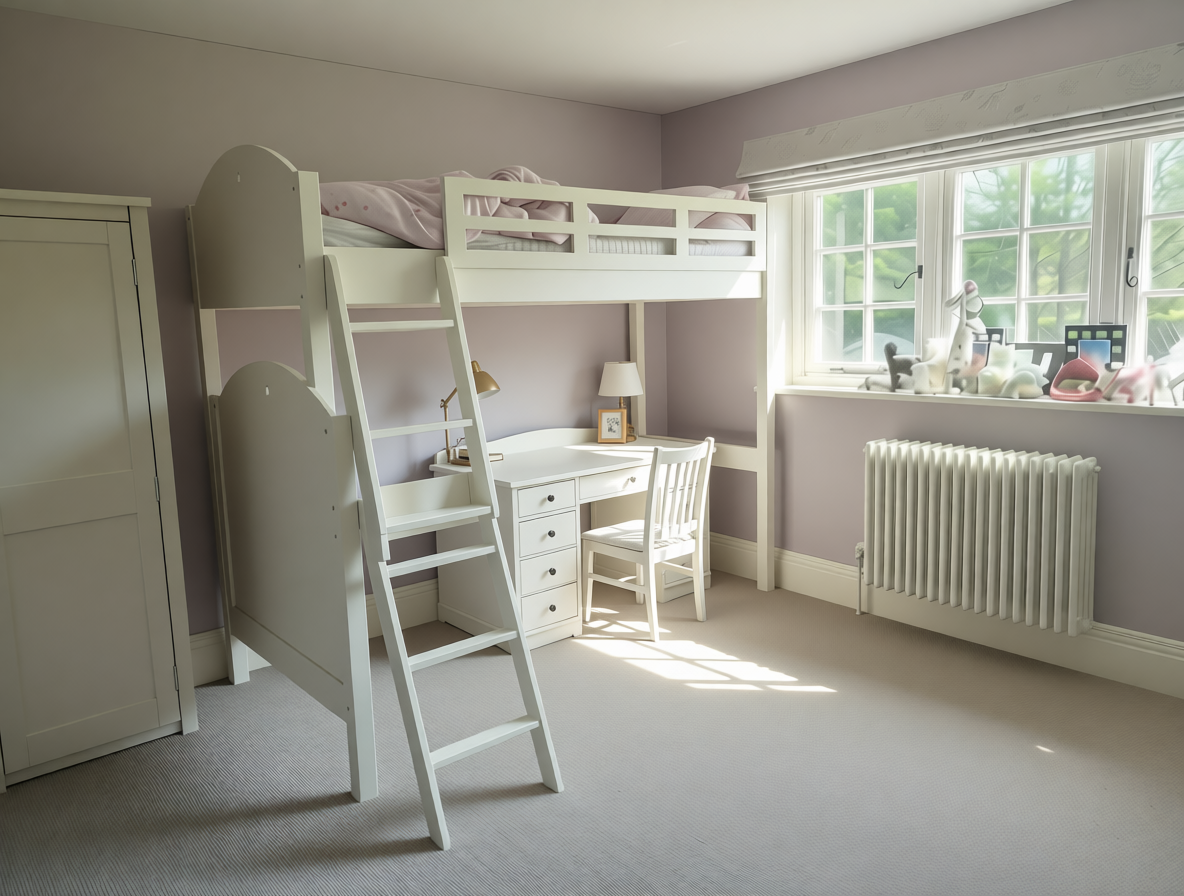 put a basket with stuffed animals to the left of the desk under the bed